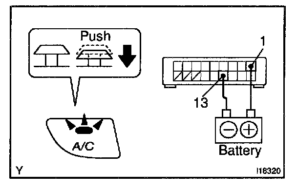 a. Connect the positive (+) lead from the battery to terminal 1 and negative (-) lead to terminal 13 while pressing the switch.