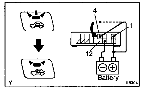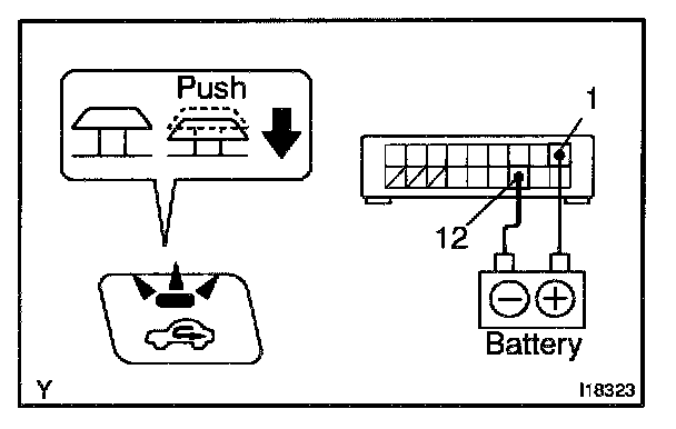 a. Connect the positive (+) lead from the battery to terminal 1 and negative (-) lead to terminal 12 while pressing the switch.