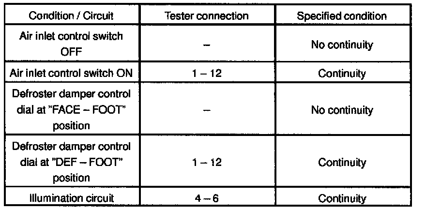 If continuity is not as specified, replace the air inlet control switch.