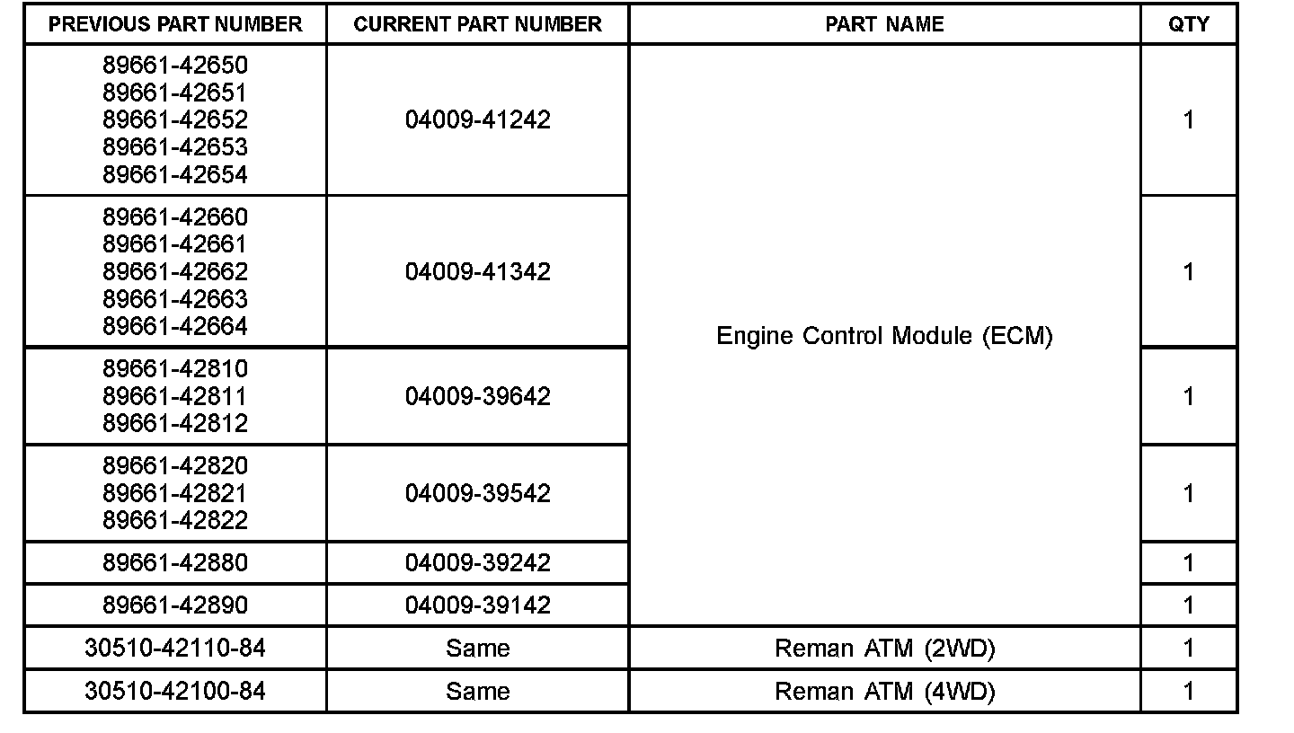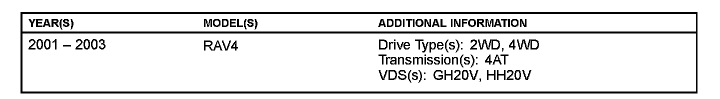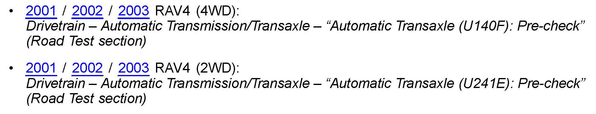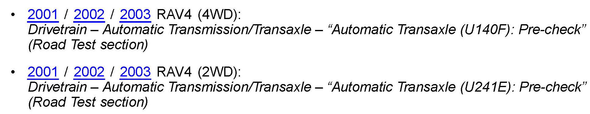 Some 2001 - 2003 model year RAV4 vehicles equipped with an automatic transaxle may exhibit a harsh shift condition and/or MIL "ON" with DTC P0750, P0753, P0755, P0758, and/or P1760 stored. Improvements have been made to the Engine Control Module (ECM) (SAE term: Powertrain Control Module/PCM) manufacturing process to reduce the possibility of this condition occurring. Use the following procedure to repair the vehicle.