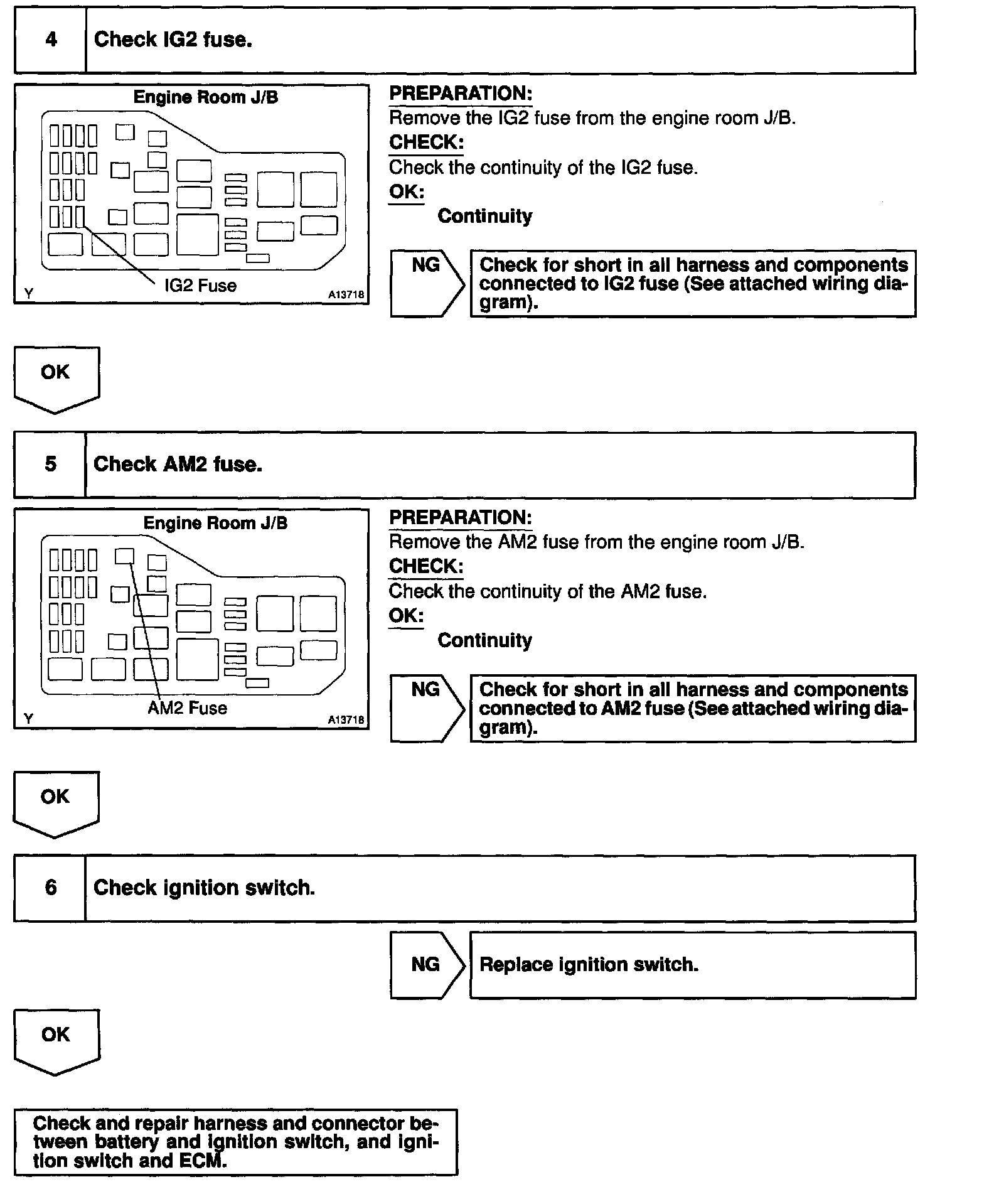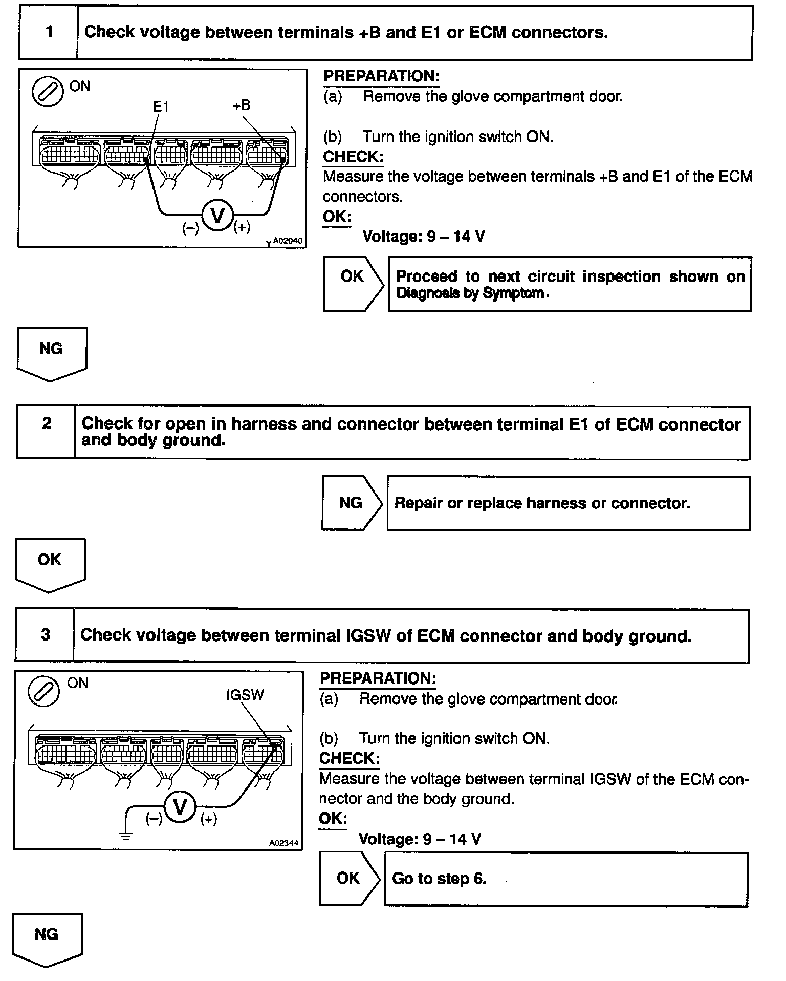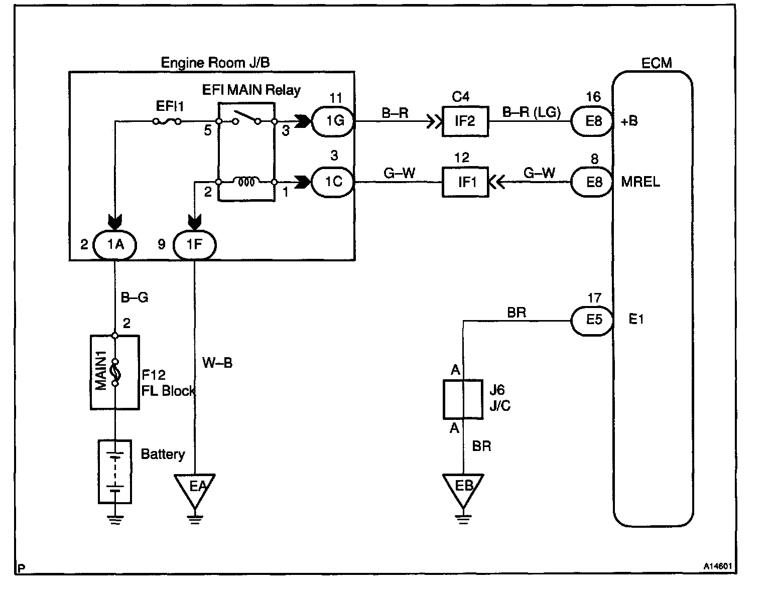 This signal causes current to flow to the coil, cutting off the contacts of the EFI main relay and supplying power to terminals +B of the ECM.