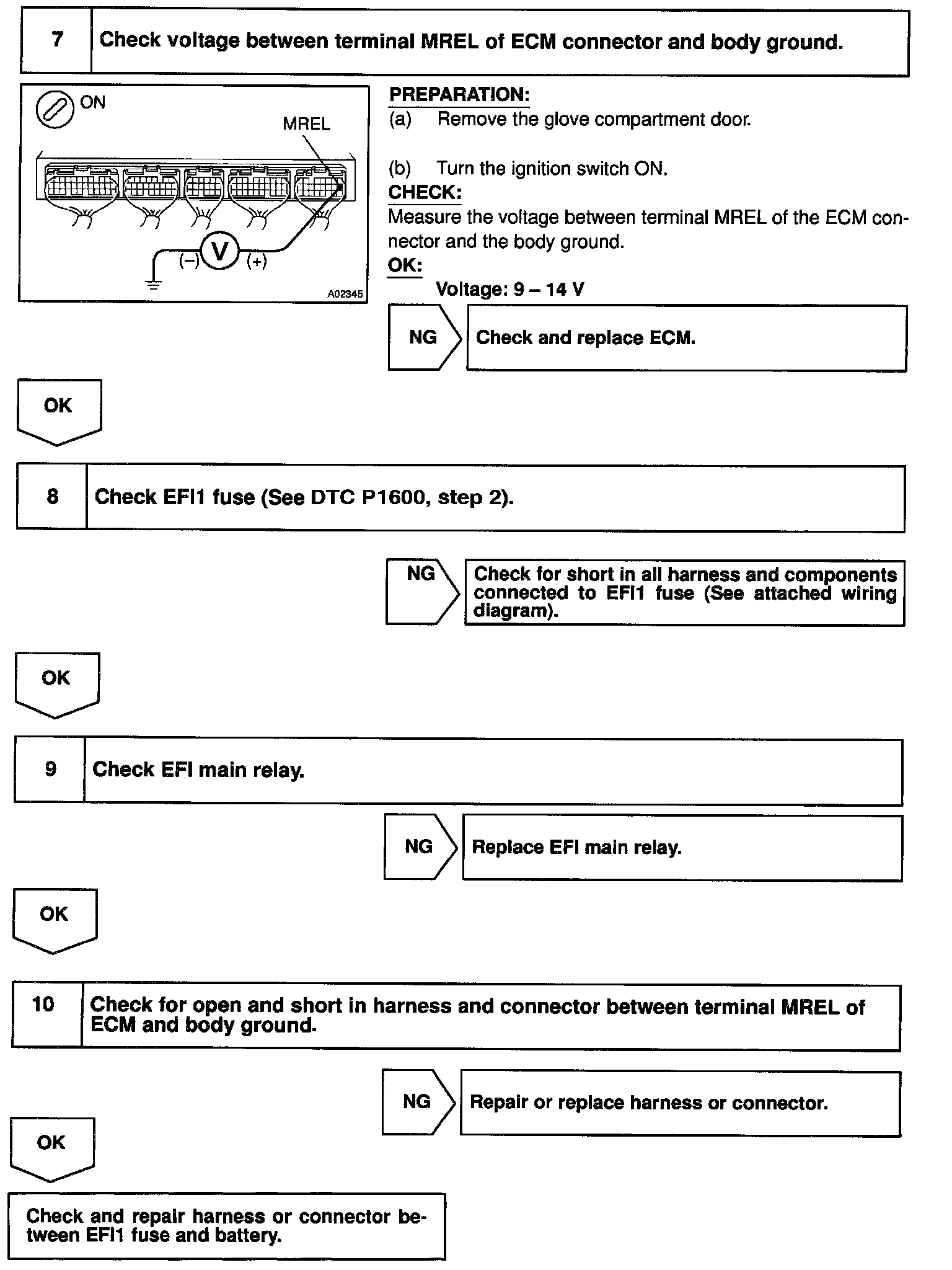 CIRCUIT INSPECTIONWhen the ignition switch is turned on, battery positive voltage is applied to 1G2 Relay, terminal IGSW of the ECM and the EFI main relay control circuit in the ECM sends a signal to terminal MREL of the ECM by switching on the EFI main relay.