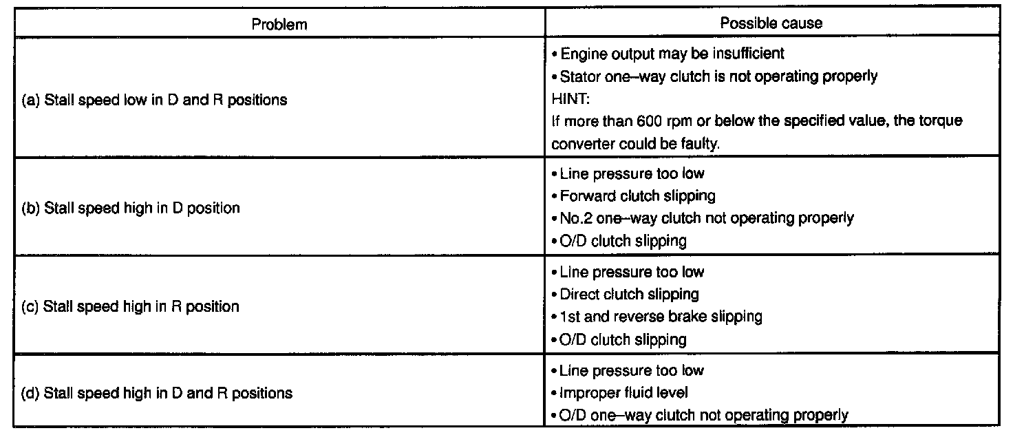 The object of this test is to check the overall performance of the transaxle and engine by measuring the stall speeds in the D and R positions.