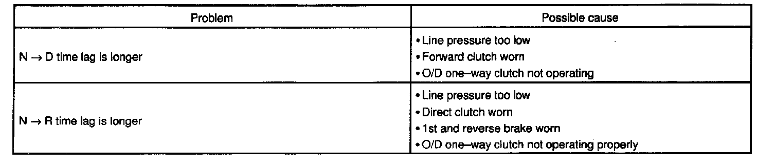When the shift lever is shifted while the engine is idling, there will be a certain time lapse or lag before the shook can be felt. This is used for checking the conditions of the O/D direct clutch, forward clutch, and 1st and reverse brake.