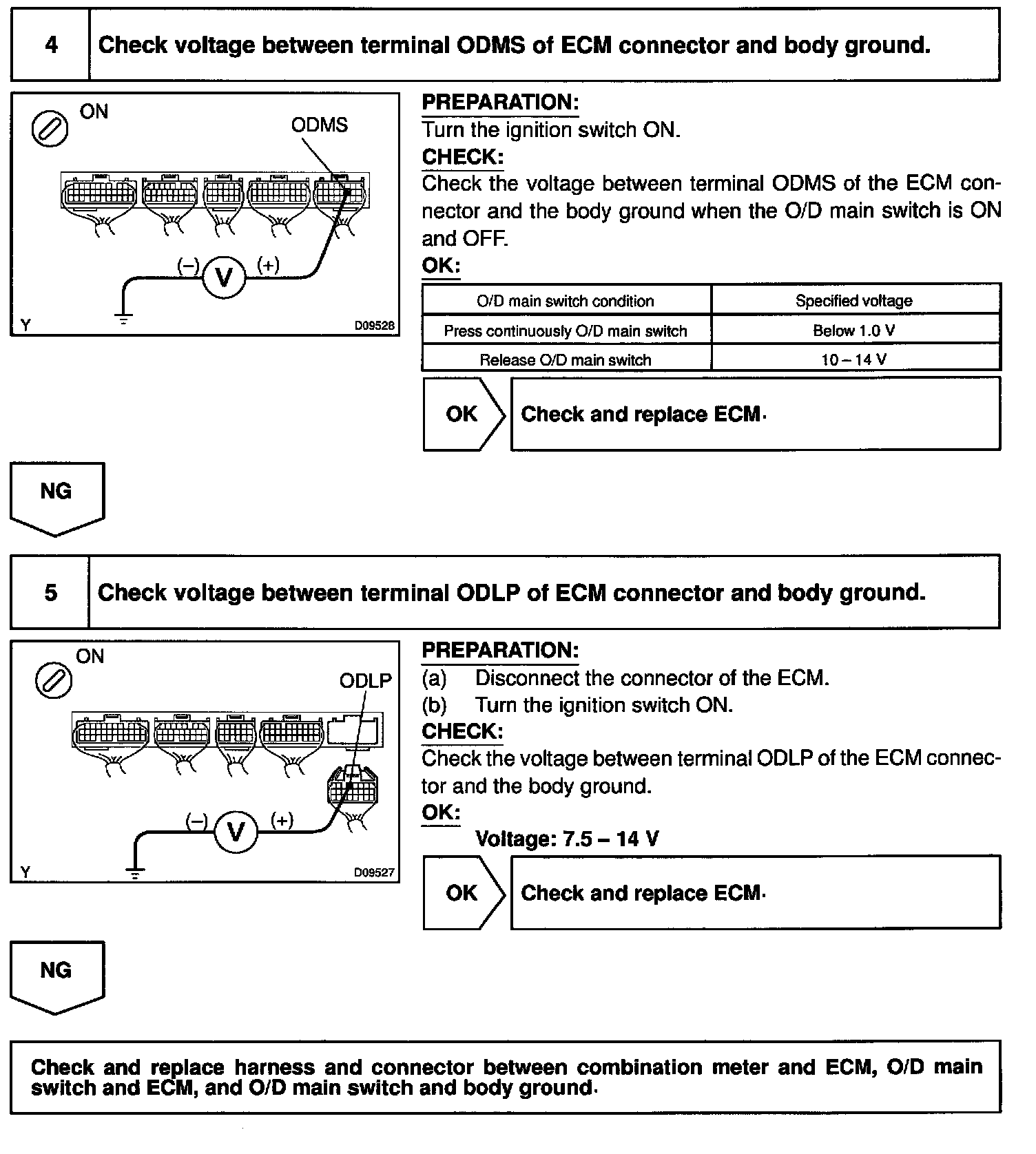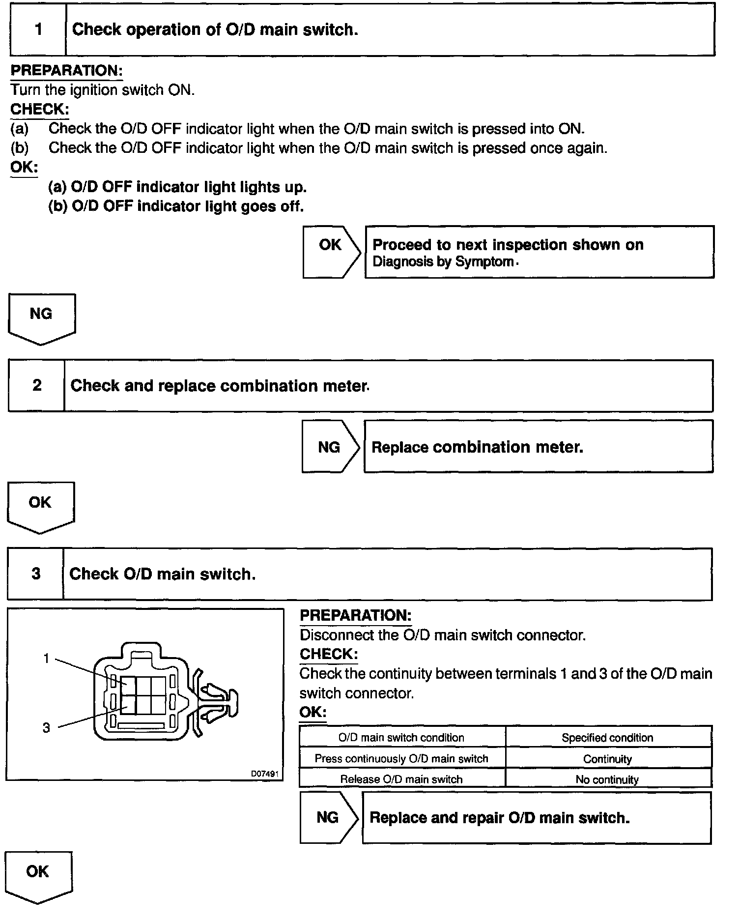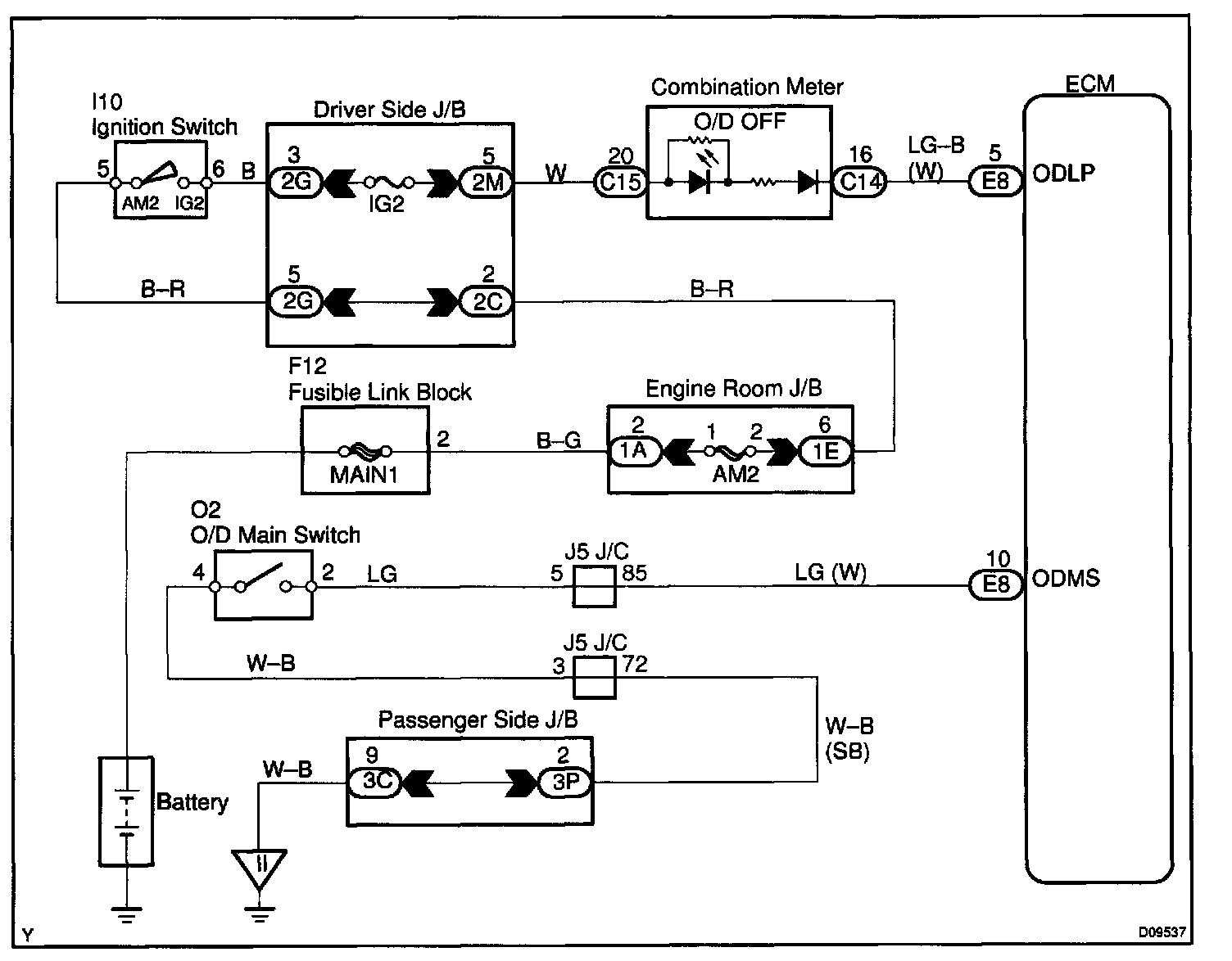 CIRCUIT DESCRIPTIONThe O/D main switch is a momentary type switch. When pressing the O/D main switch, the O/D OFF indicator light lights up and the ECM prohibits shifting into O/D, and when pressing it once again, the O/D OFF indicator light goes off and the ECM allows shifting into O/D. Turning the IG switch OFF will reset the O/D OFF indicator light.