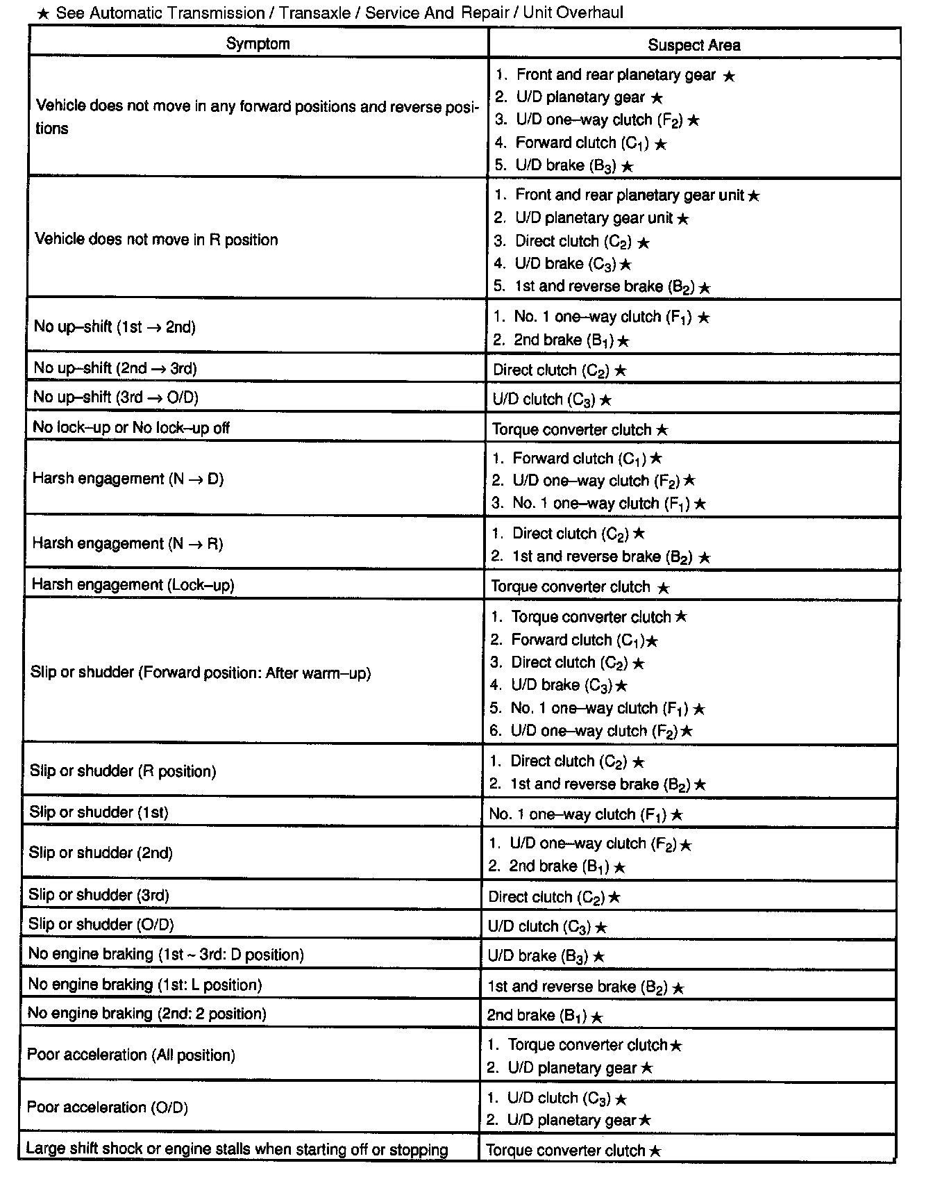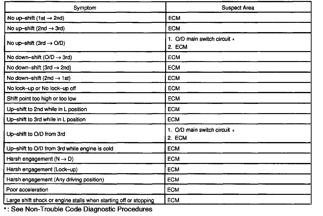 PROBLEM SYMPTOMS TABLEIf a normal code is displayed during the diagnostic trouble code check although the trouble still occurs, check the circuits for each symptom in the order given in the charts and proceed to the appropriate troubleshooting given.