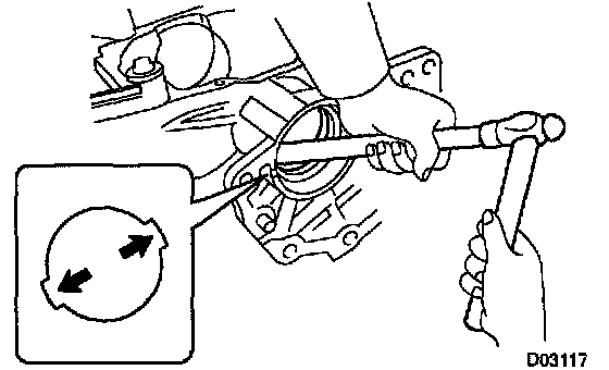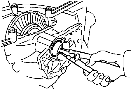 c. Using a screwdriver and hammer, make clearance by hitting between the bearing retainer RH and transfer case.