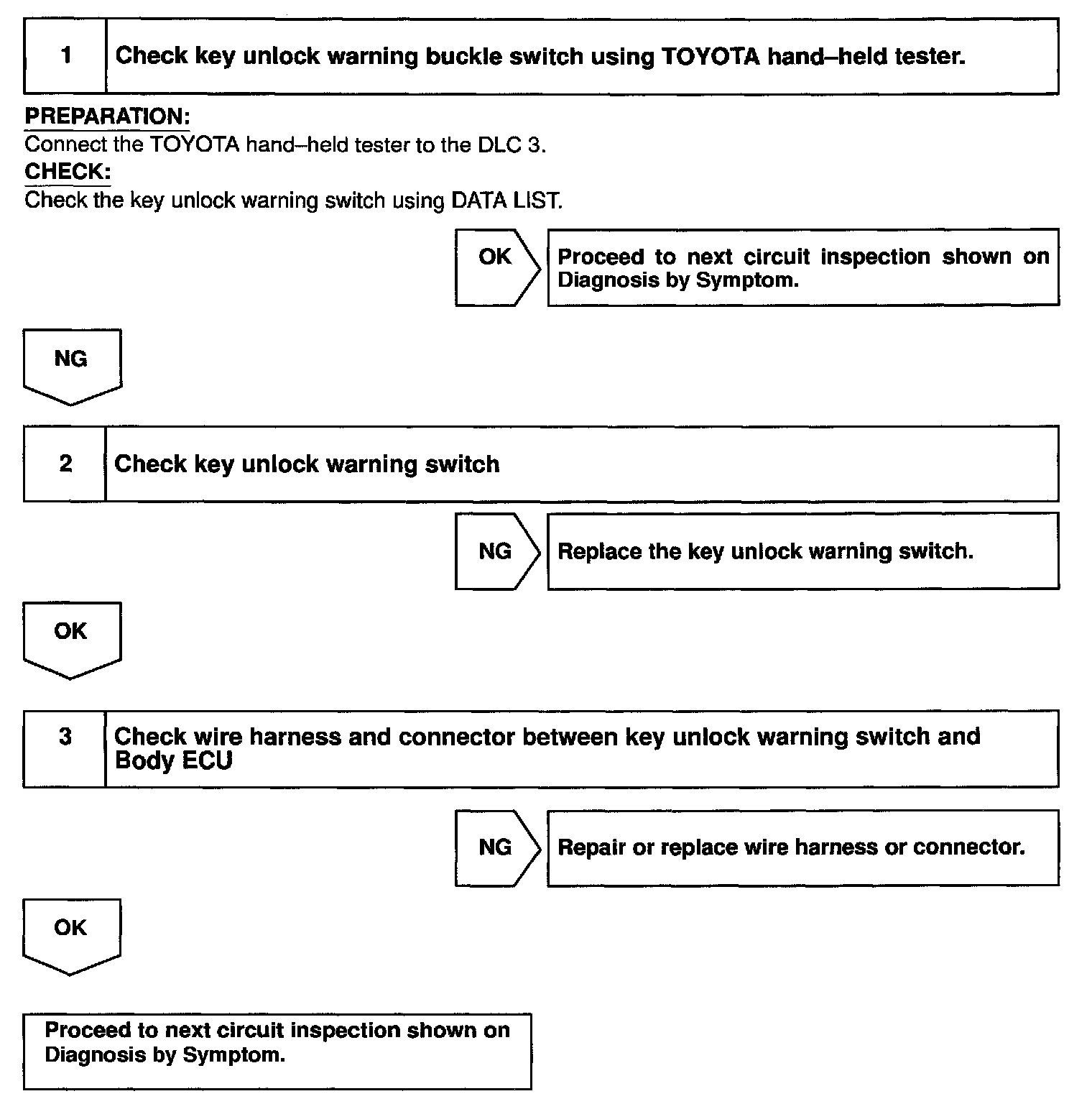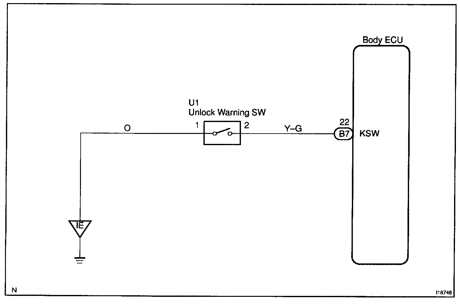 CIRCUIT DESCRIPTIONThe key unlock warning switch goes on when the ignition key is inserted in the key cylinder and goes off when the ignition key is removed.