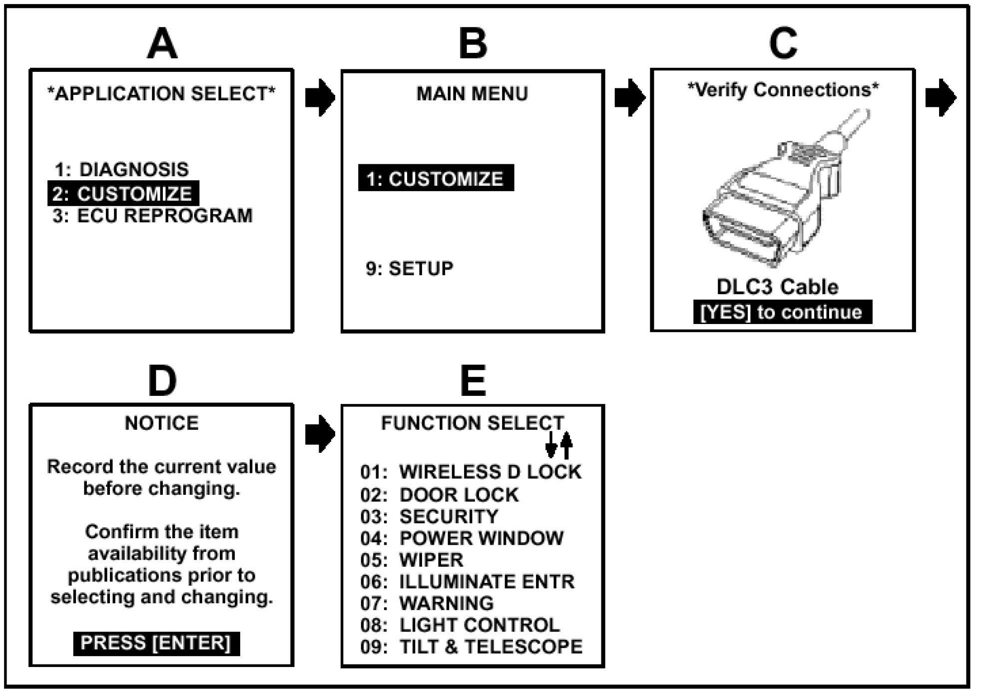 3. Using the Diagnostic Tester, follow the screen flow below to access the customize function select menu.