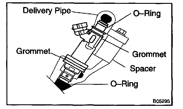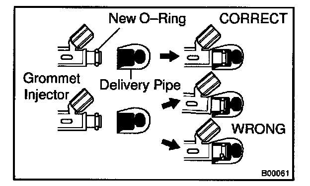 Before installing the injector, must apply spindle oil or gasoline on the place where a delivery pipe or an intake manifold touches an O-ring of the injector.