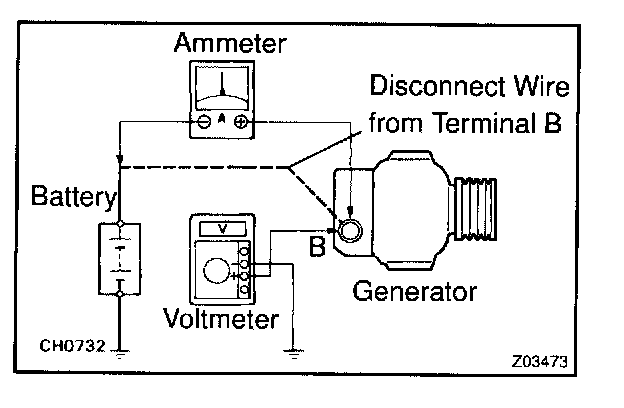 - Disconnect the wire from terminal B of the generator, and connect it to the negative (-) tester probe of the ammeter.