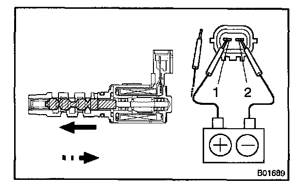 Connect the positive (+) lead from the battery to terminal 1 and negative (-) lead to terminal 2, and check the movement of the valve.