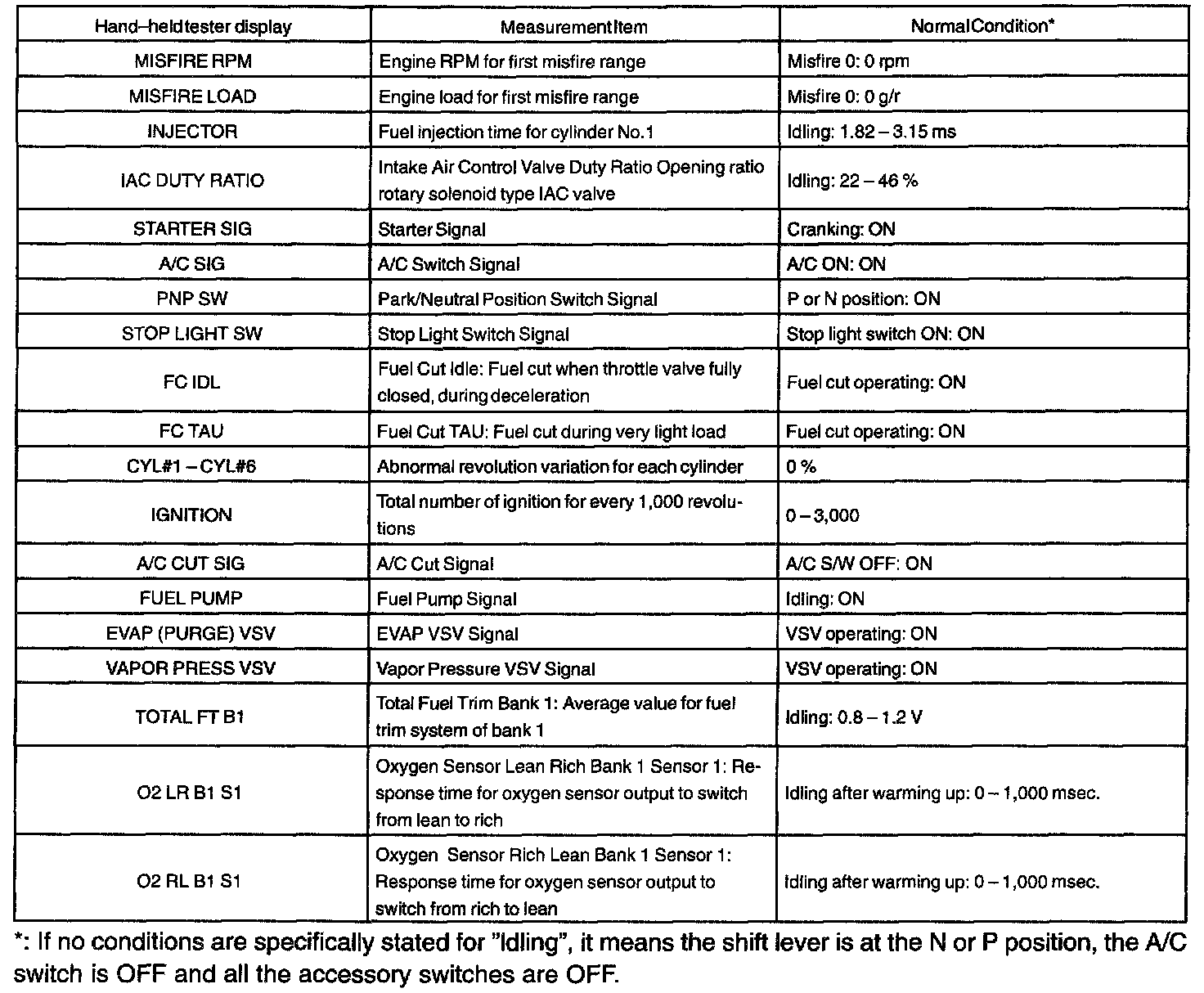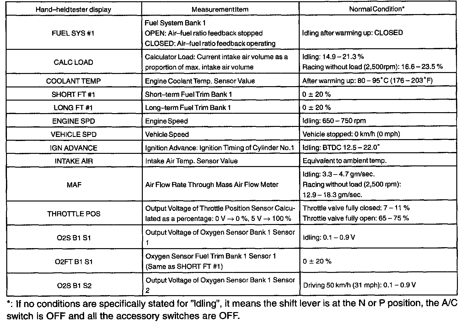 NOTE: The values given for "Normal Condition" are representative values, so a vehicle may still be normal even if its value differs from those listed here. So do not depend solely on the "Normal Condition" here when deciding whether a part is faulty or not solely according to the "Normal Condition" here.