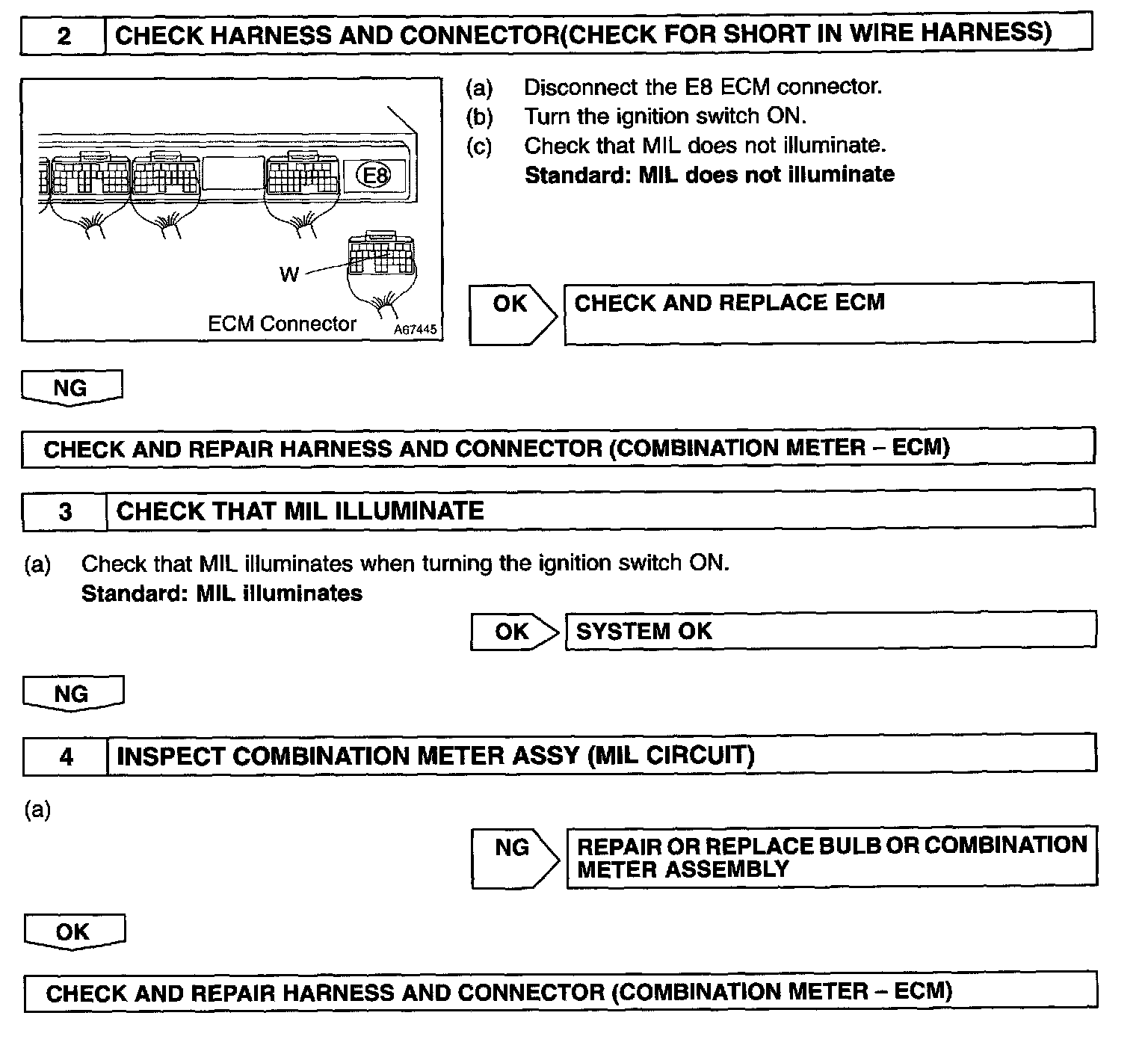 If the ECM detects a trouble, the MIL illuminates. At this time, the ECM records a DTC in the memory.