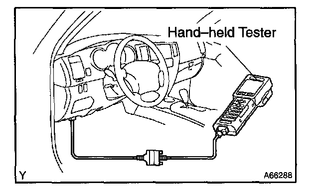8. After simulating the malfunction conditions, use the hand-held tester diagnosis selector to check the DTC and freeze frame data, etc.