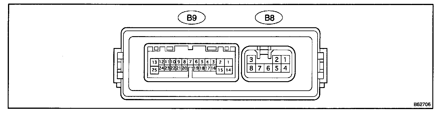 a. Disconnect the B8 and B9 ECU connectors, and check the voltage or continuity of each terminal of the wire harness side connectors.