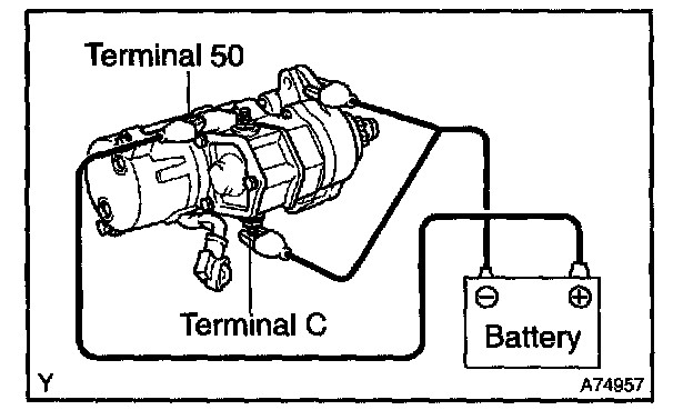1. With battery connected as above with the clutch pinion gear out, disconnect the negative (-) lead from terminal C. Check that the pinion gear remains out.