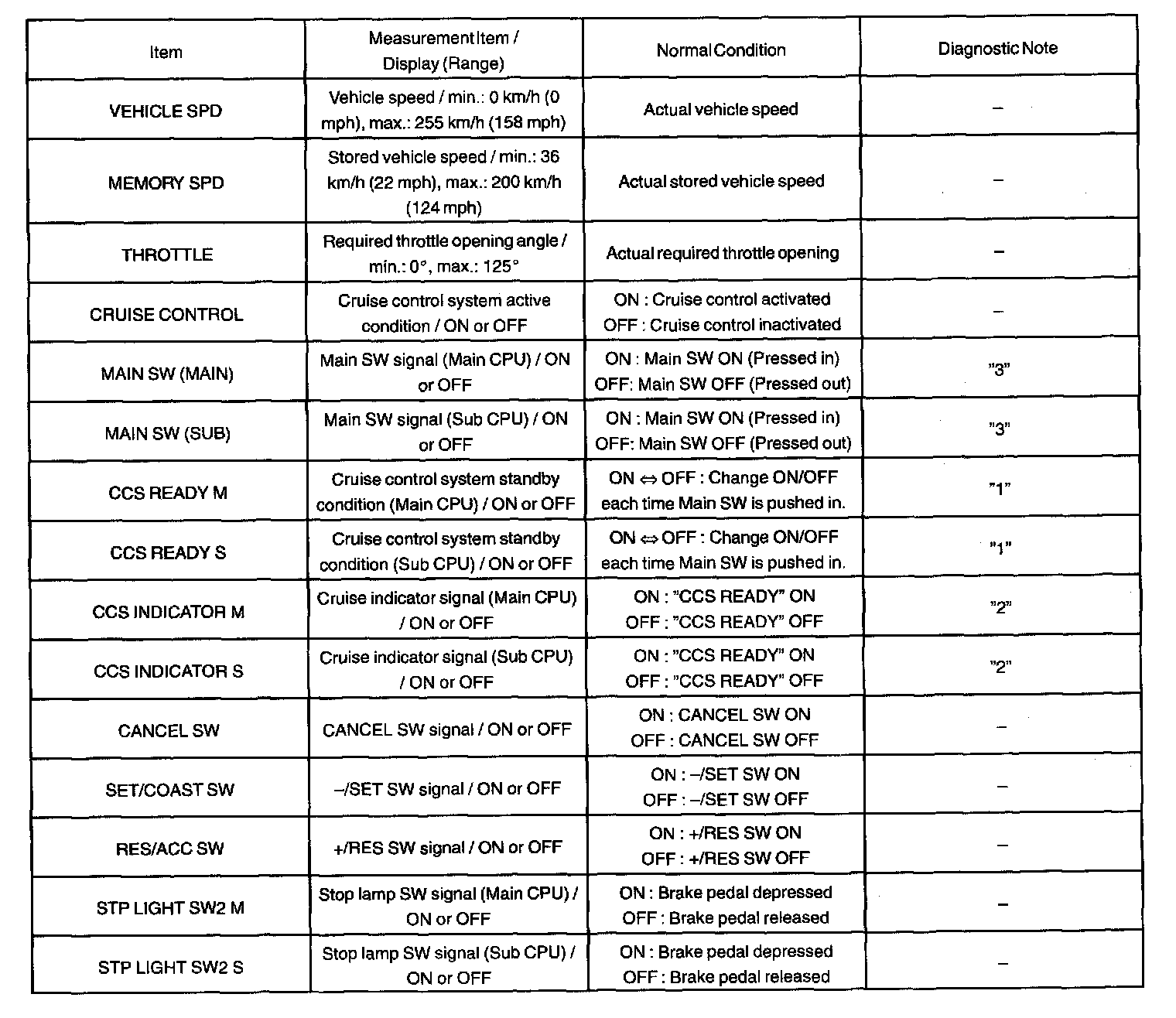 "3" is OK but cruise indicator not turn on->CRUISE MAIN indicator or wire harness or ECM failure.