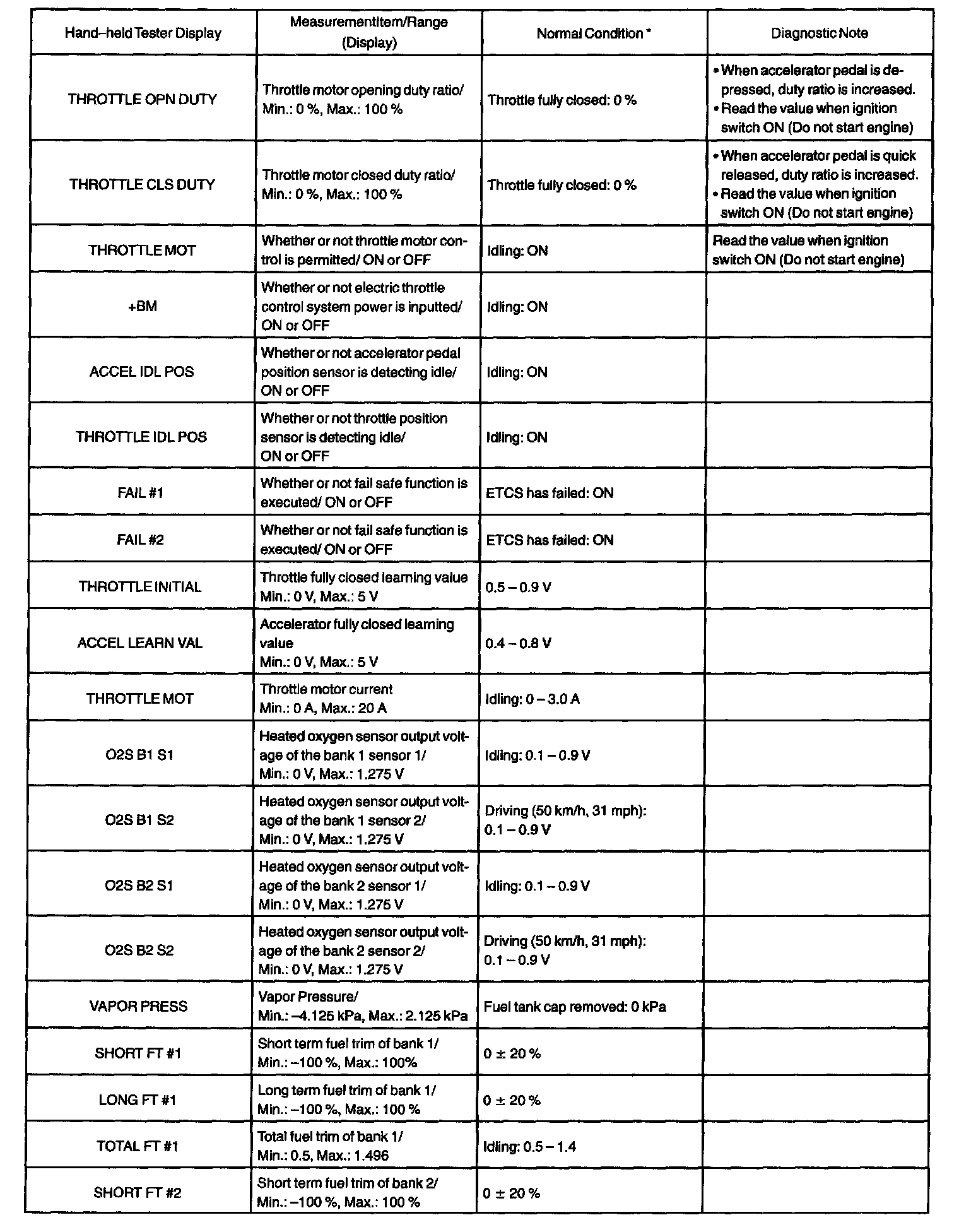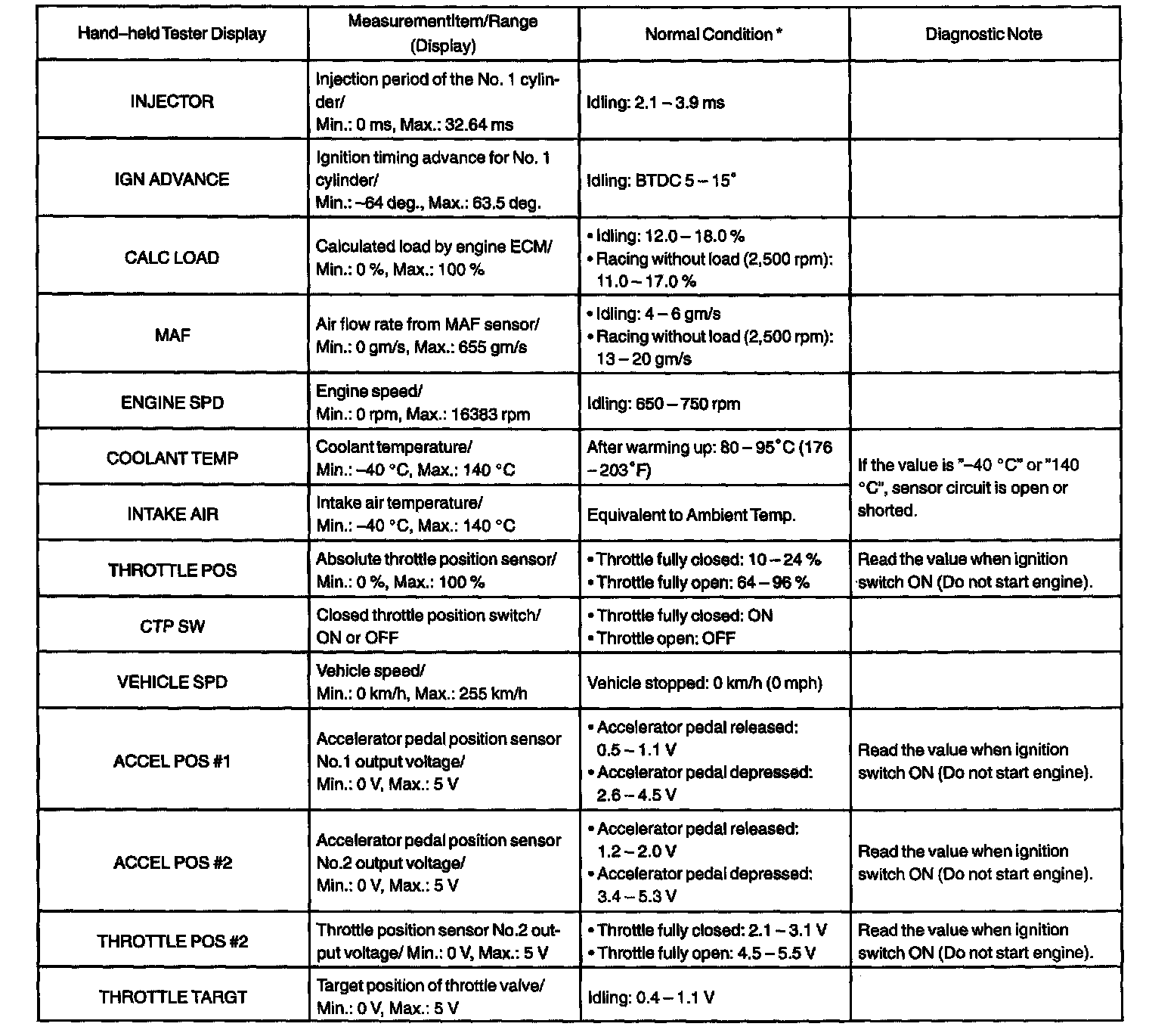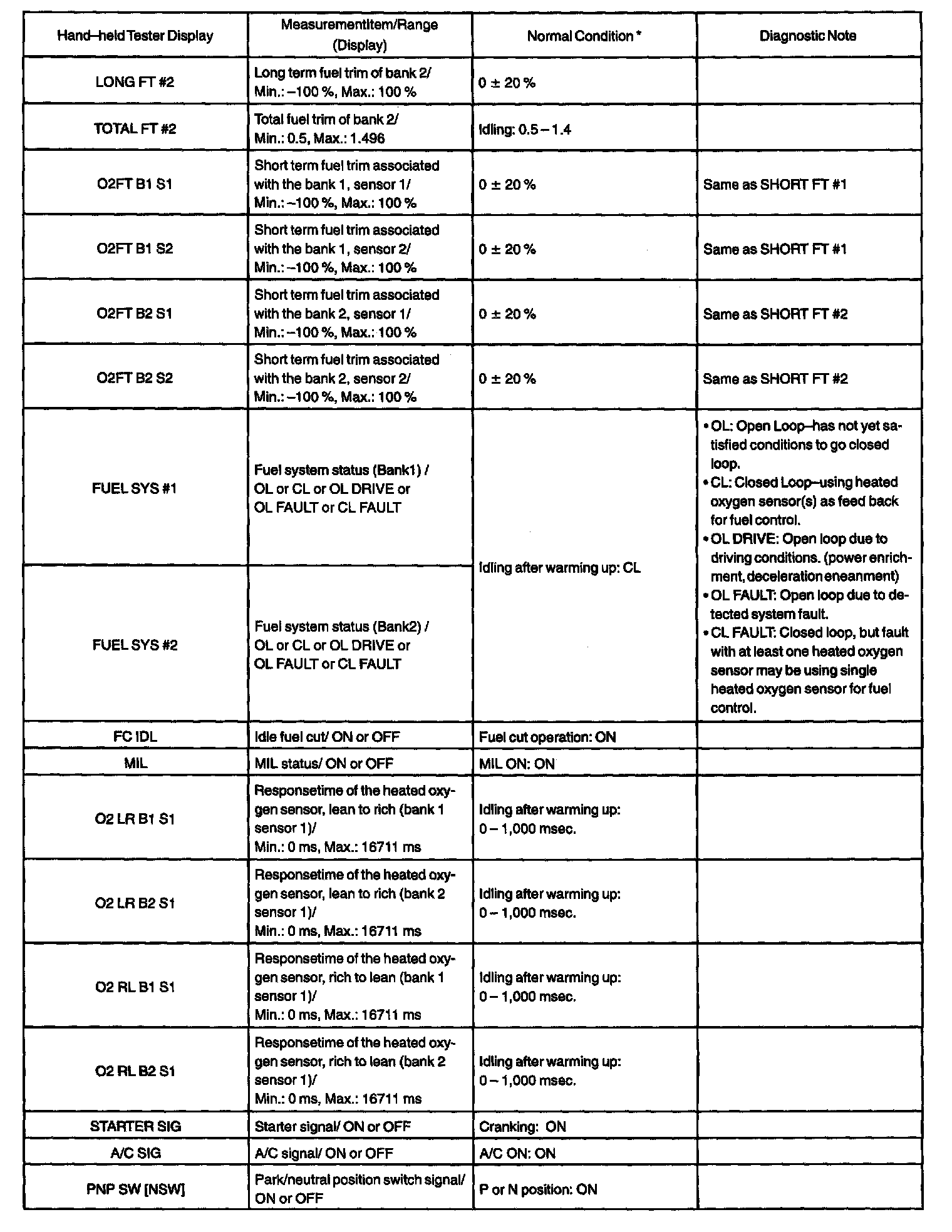 NOTE: The values given for "Normal Condition" are representative values. So, a vehicle may still be normal even if its value differs from those listed here. So, do not solely depend on the "Normal Condition" here when deciding whether a part is faulty or not.