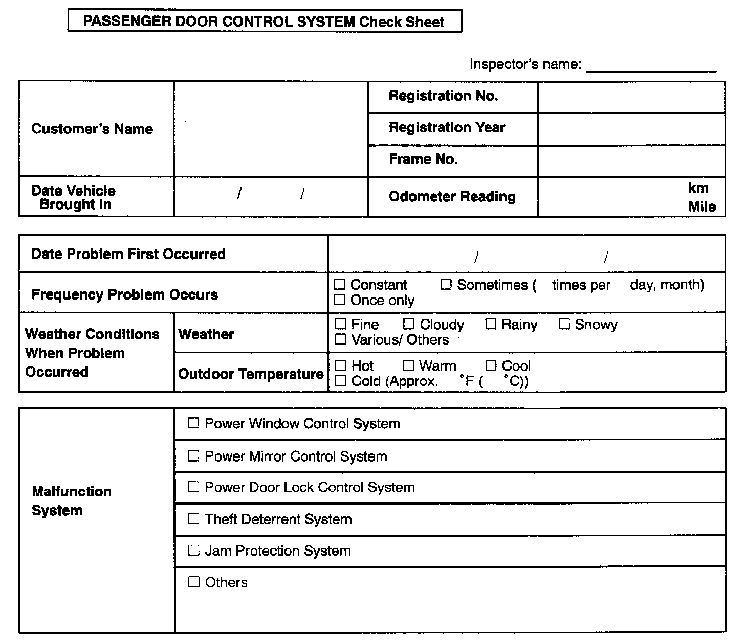 Passenger Door Control System Check Sheet: