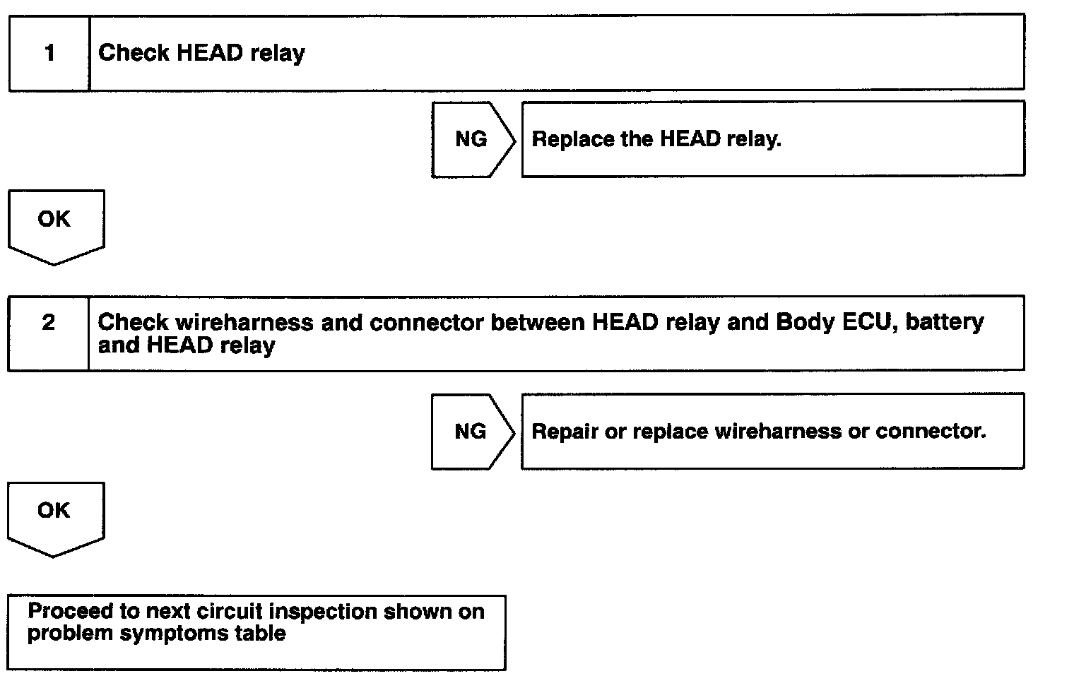 CIRCUIT DESCRIPTIONHead light relay will be "ON" by operating the headlight switch. The transistor which activates the taillight relay has two sorts: one activates directly by the headlight switch for fail safe and the other activates by CPU. the one that activates by CPU has two systems and prevents the headlight from turning off at the time of one system trouble in the automatic operation circuit.