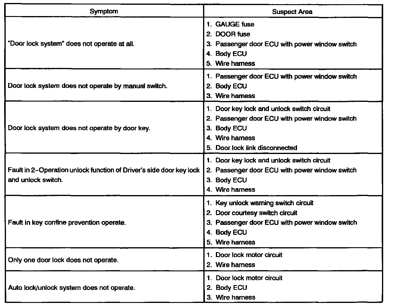 Problem Symptoms Table - Power Door Lock Control System: