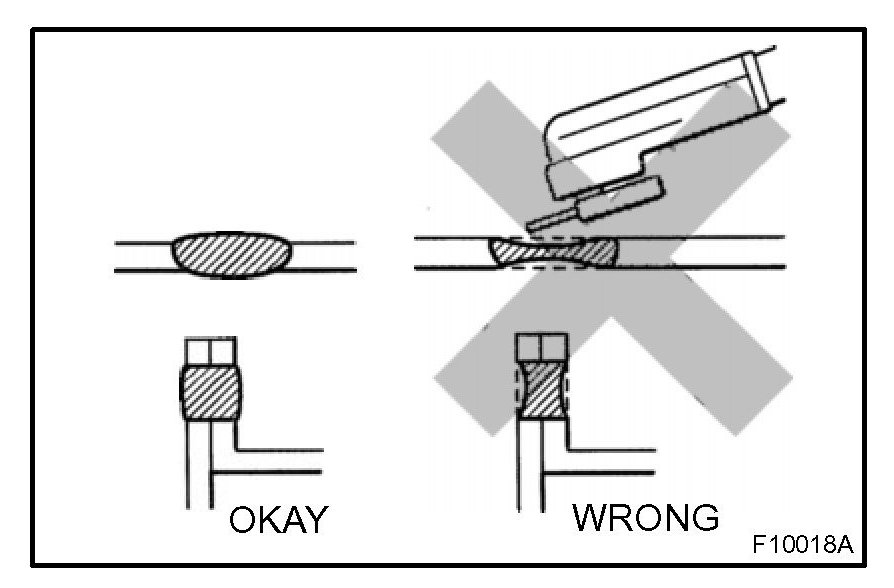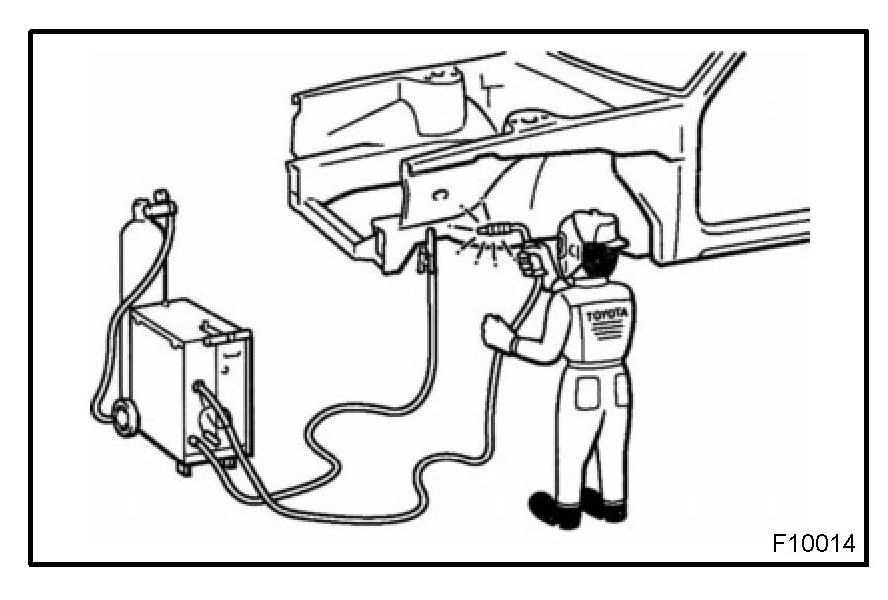 2. Plug welding should be done with a MIG (Metal Inert Gas) welder. Do not gas weld or braze panels at areas other than specified.