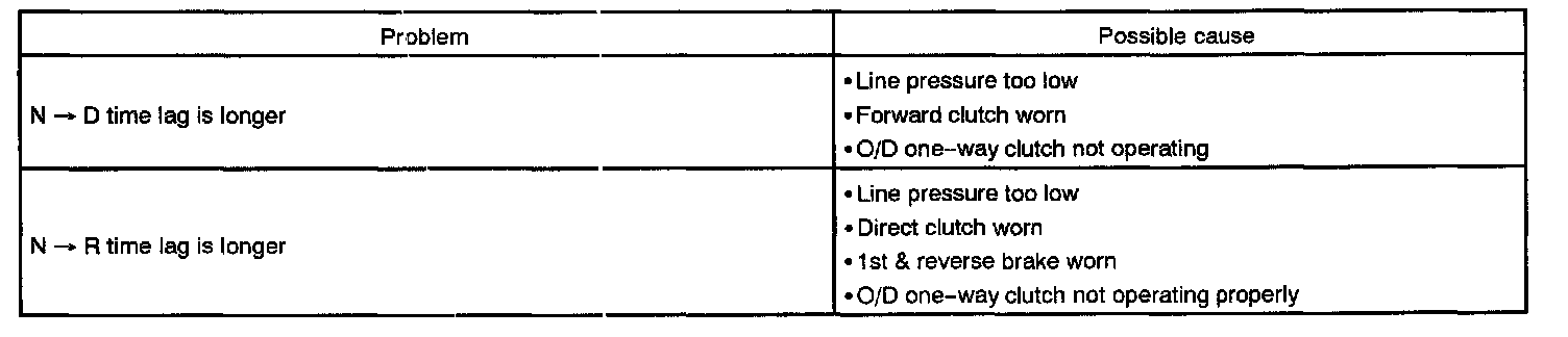 When the shift lever is shifted while the engine is idling, there will be a certain time lapse or lag before the shock can be felt. This is used for checking the conditions of the O/D direct clutch, forward clutch, and 1st & reverse brake.