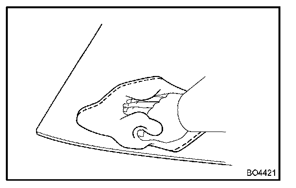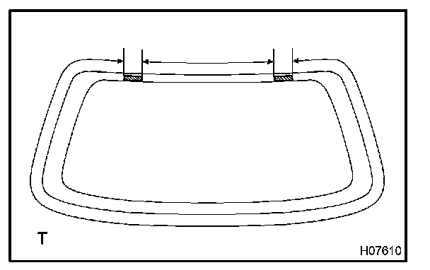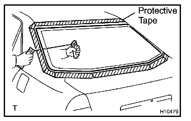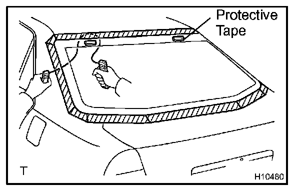 b. Hold the back window glass in place securely with a protective tape or equivalent until the adhesive hardens.