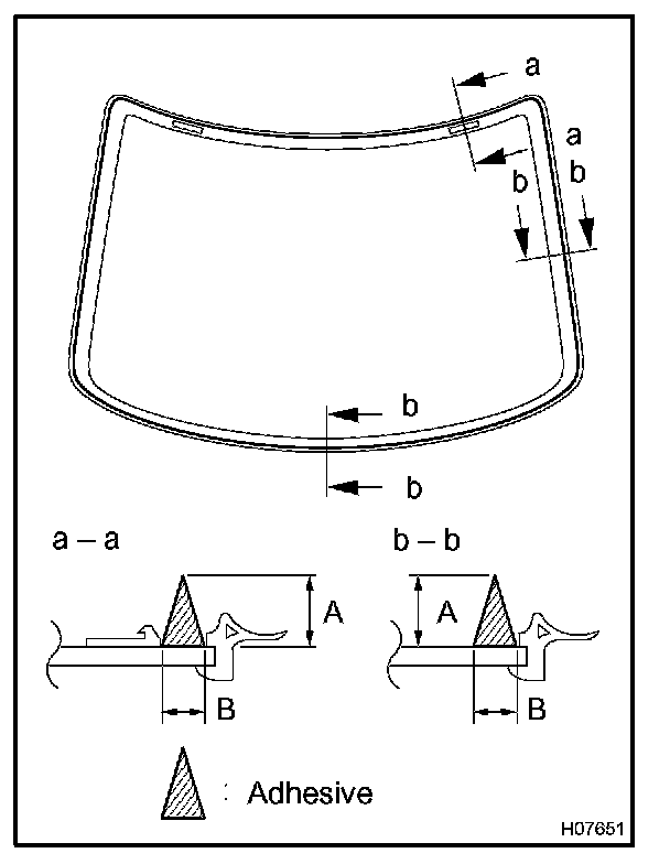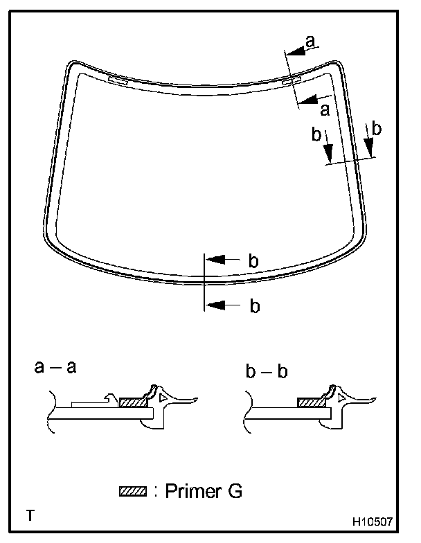 a. Using a brush or sponge, coat the edge of the glass and the contact surface with Primer G as shown in the illustration.