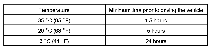 NOTE: Take care not to drive the vehicle during the time described in the table.