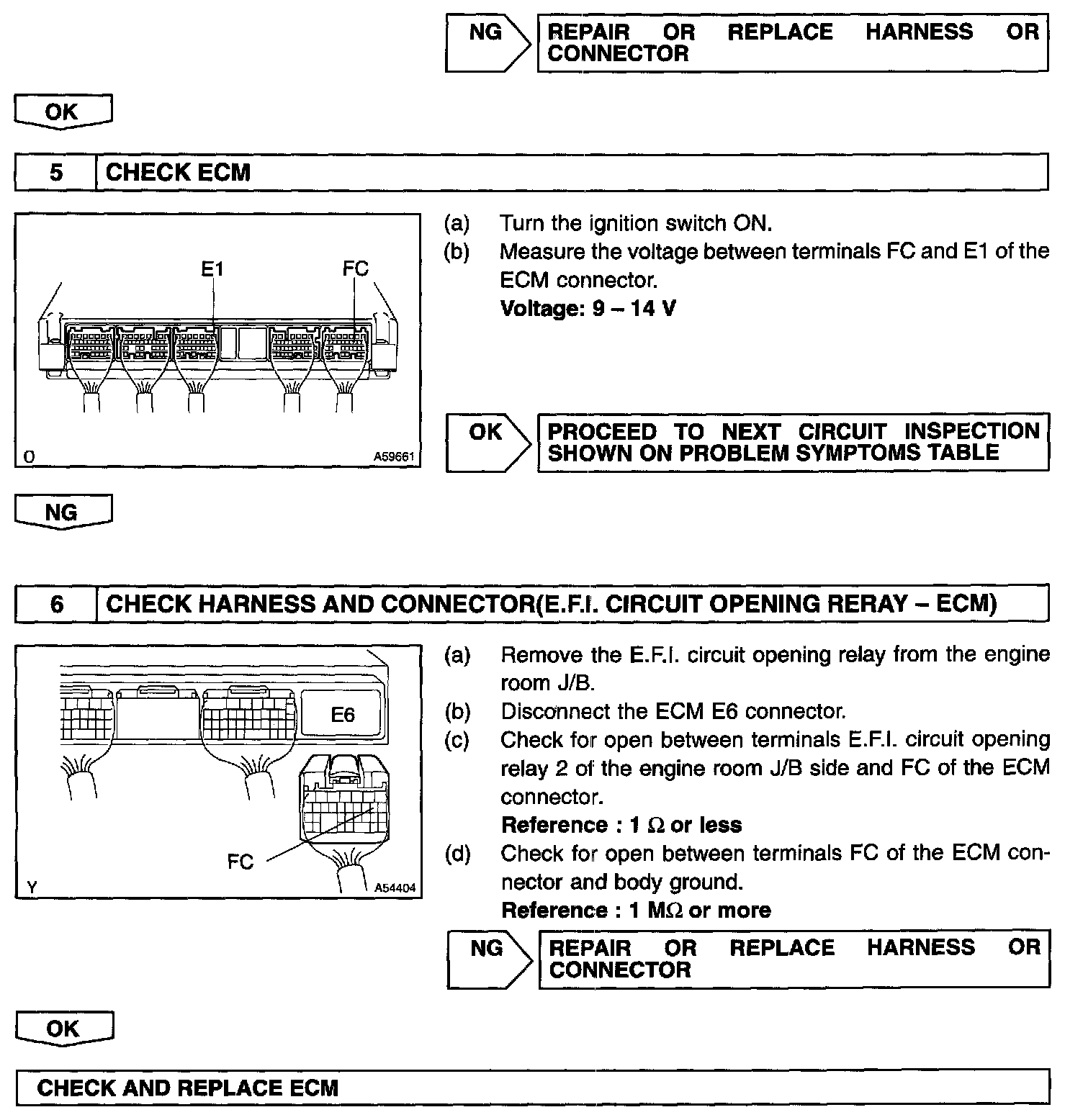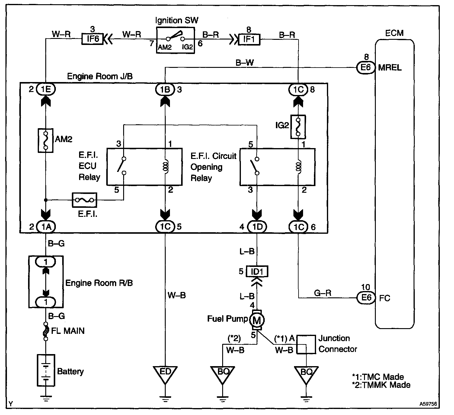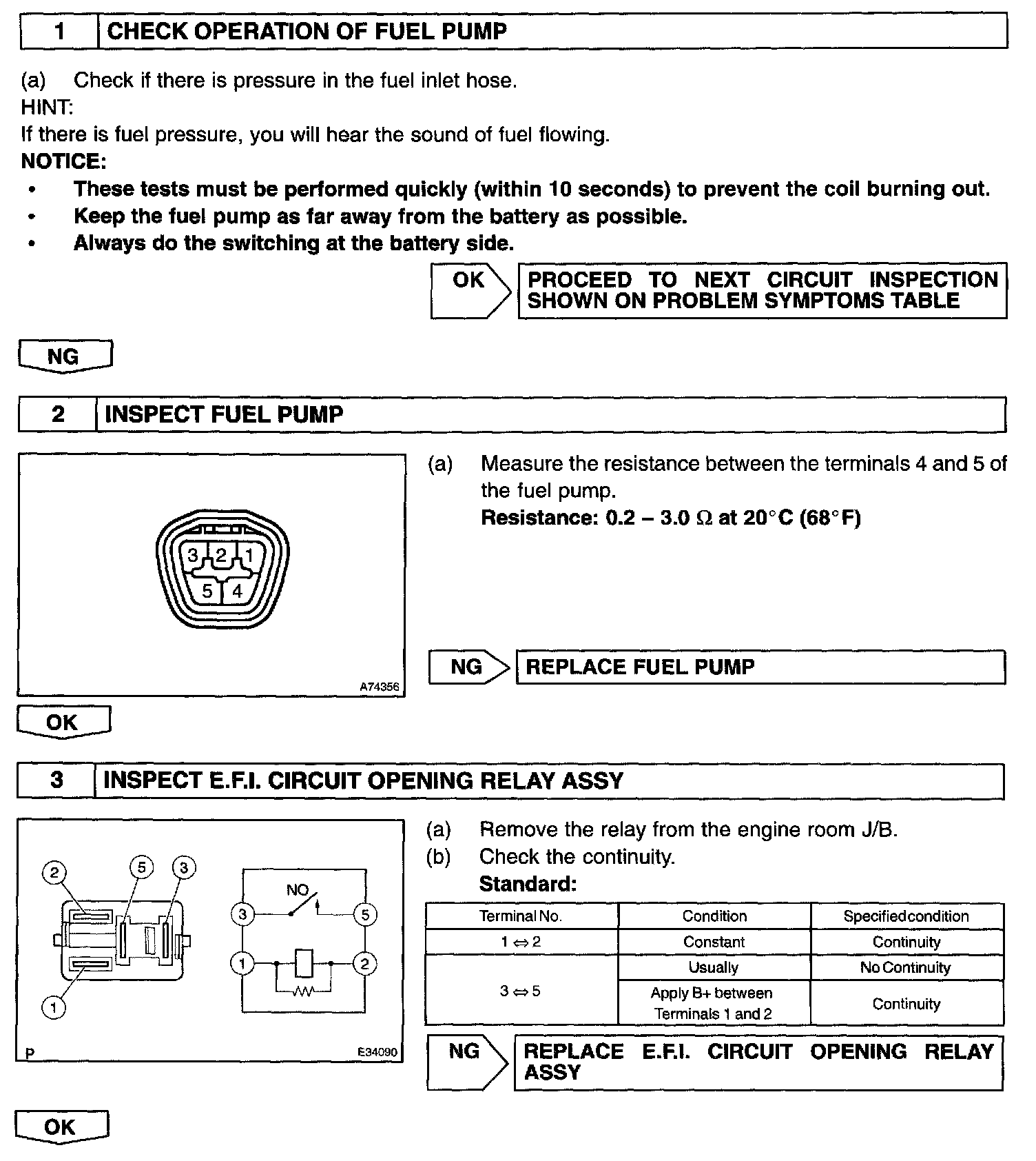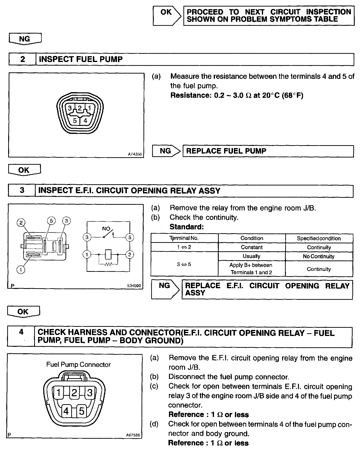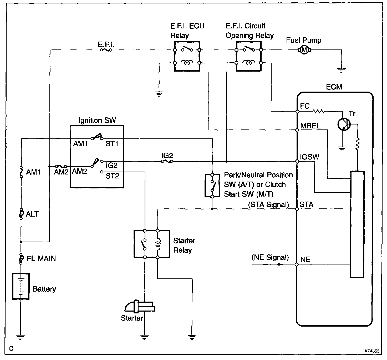 When the STA signal and NE signal are input to the ECM, Tr is turned ON, current flows to the coil of the E.F.I circuit opening relay, the relay switches on, power is supplied to the fuel pump and the fuel pump operates.