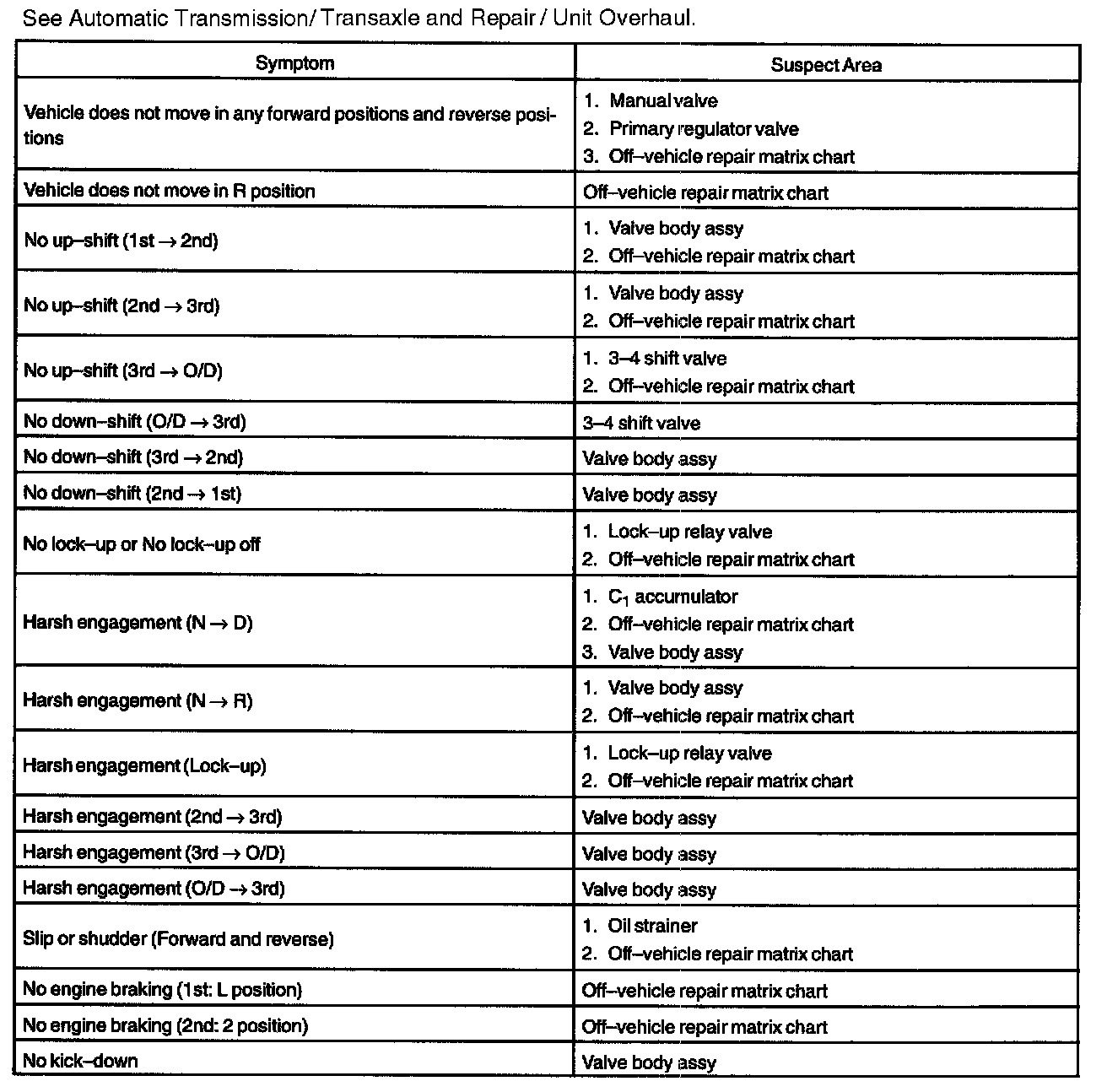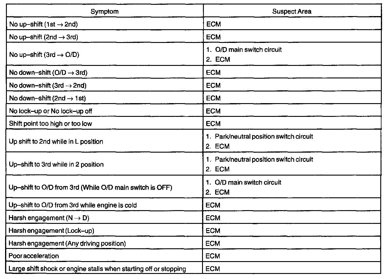 PROBLEM SYMPTOMS TABLEHINT: If a normal code is displayed during the diagnostic trouble code check although the trouble still occurs, check the circuits for each symptom in the order given in the charts and proceed to the troubleshooting.