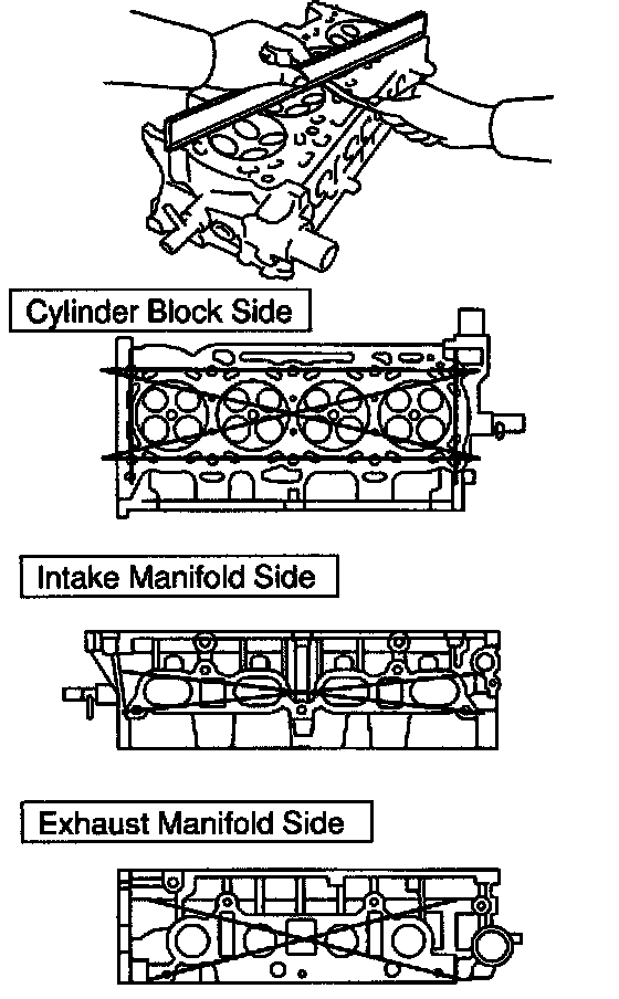 a. Using a precision straight edge and a feeler gauge, measure the surface contacting the cylinder block and the manifolds for warpage.