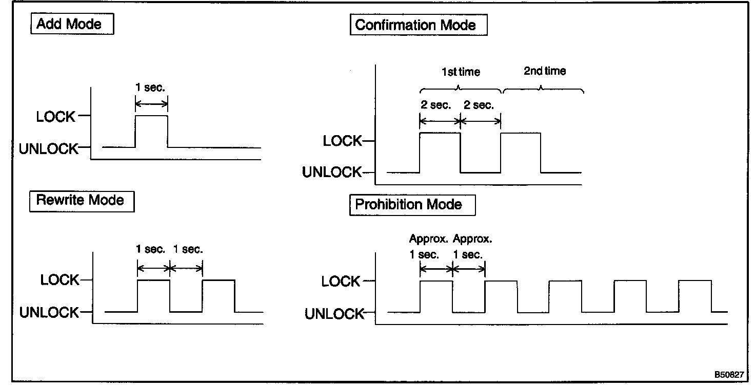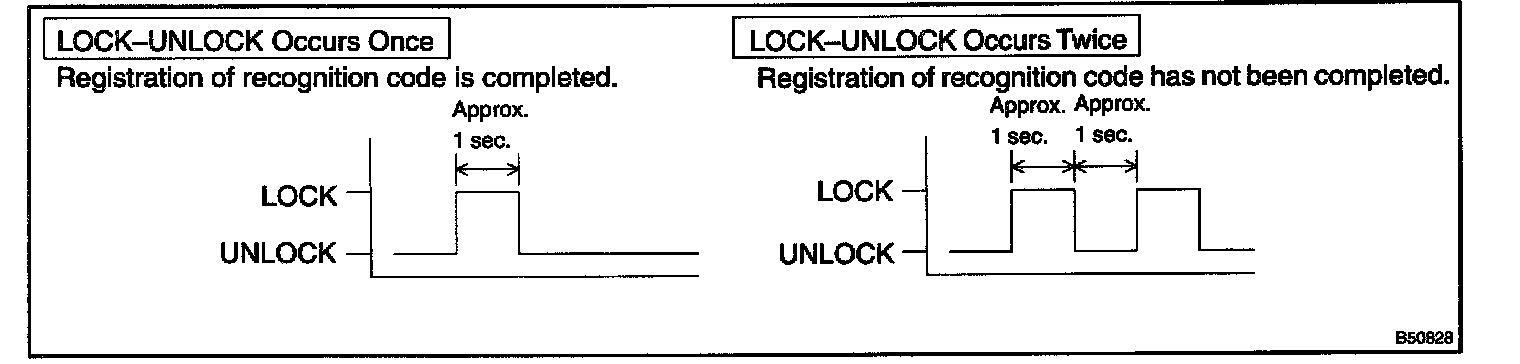 2. LOCK-UNLOCK operation is automatically performed once within 3 seconds after above operation (step 1), when the recognition code of the transmitter has been registered correctly. If the LOCK-UNLOCK operation is performed twice, the registration of the recognition code has failed. In this case, register the recognition code from the beginning of the registration procedures once again.