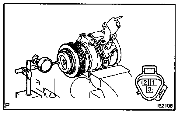 b. Connect the battery positive lead to the terminal 3 of magnet clutch connector and the negative lead to the earth wire. Turn on and off the magnet clutch and measure the clearance.