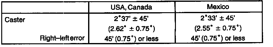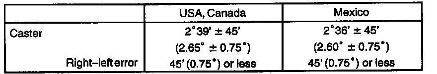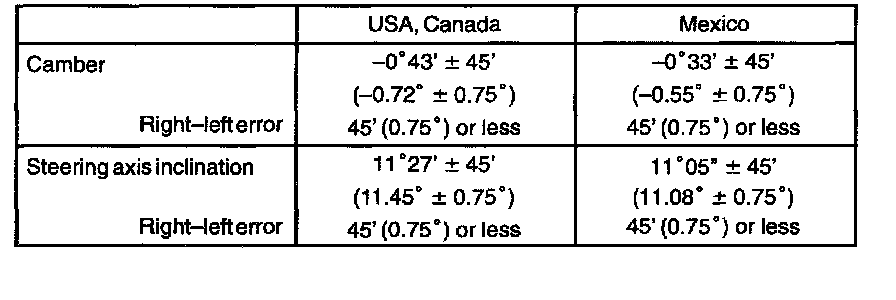 If the caster and steering axis inclination are not within the specified values, after the camber has been correctly adjusted, recheck the suspension parts for damaged and/or worn out parts.