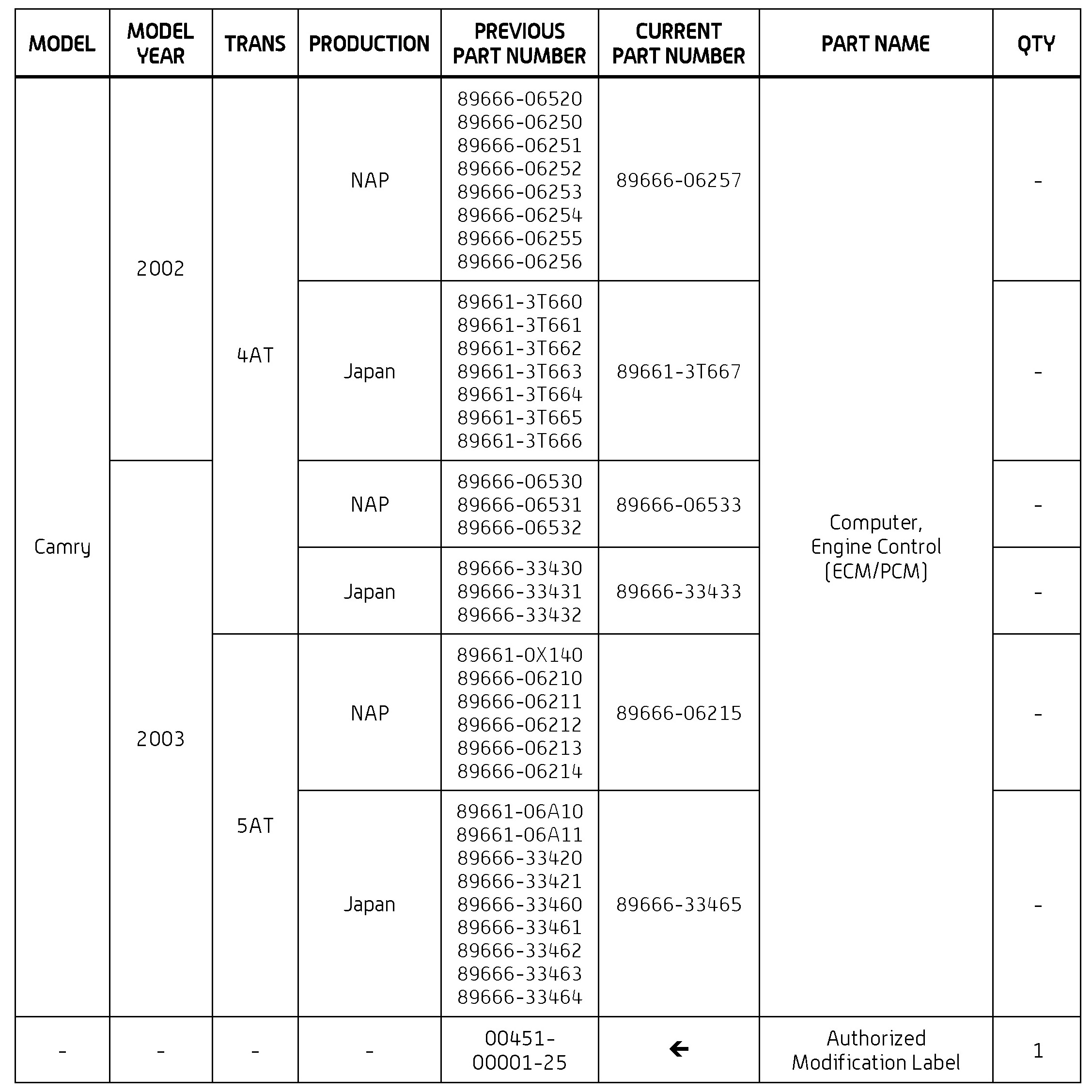 Some 2002 - 2003 model year Camry vehicles may exhibit a MIL "ON" condition with Diagnostic Trouble Code (DTC) P0500 - Vehicle Speed Sensor "A". The Engine Control Module/ECM (SAE term: Powertrain Control Module/PCM) has been modified to reduce the possibility of this condition occurring.