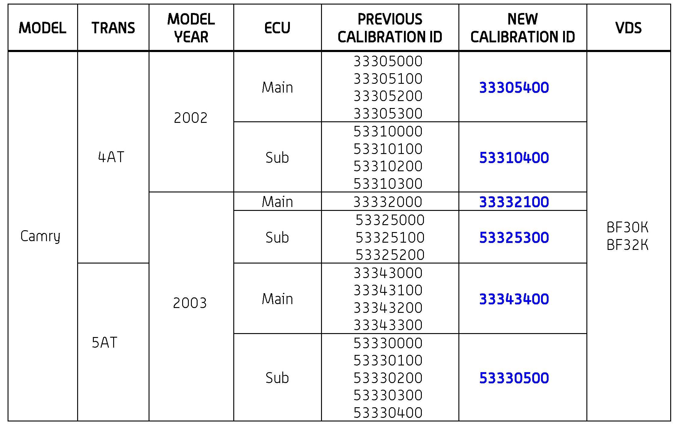 - Calibration ID(s) [Refer to the Calibration Identification Chart for the NEW CALIBRATION ID]