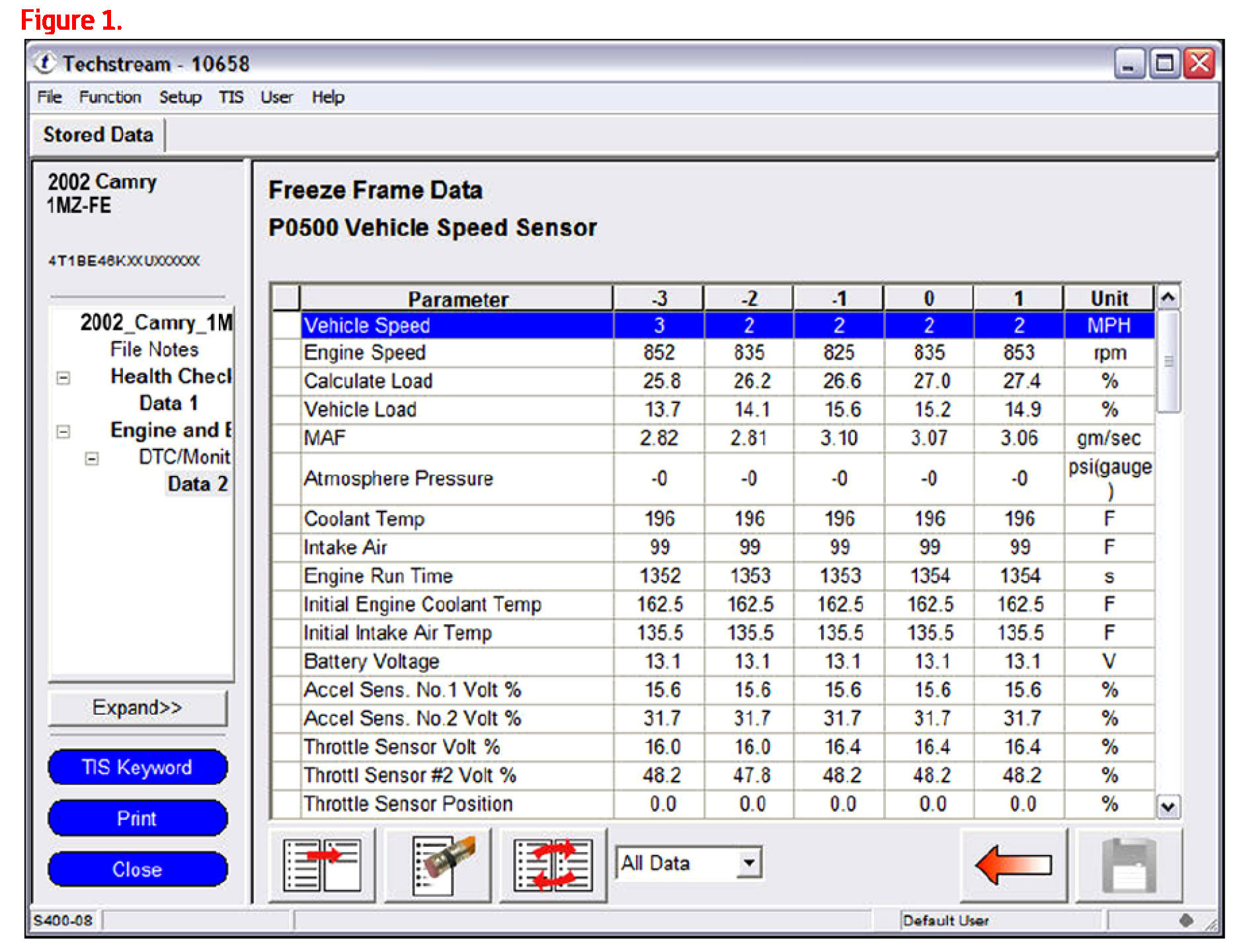 1. Inspect the Freeze Frame Data stored under "Engine and ECT" with the DTC P0500. (See Figure 1.)