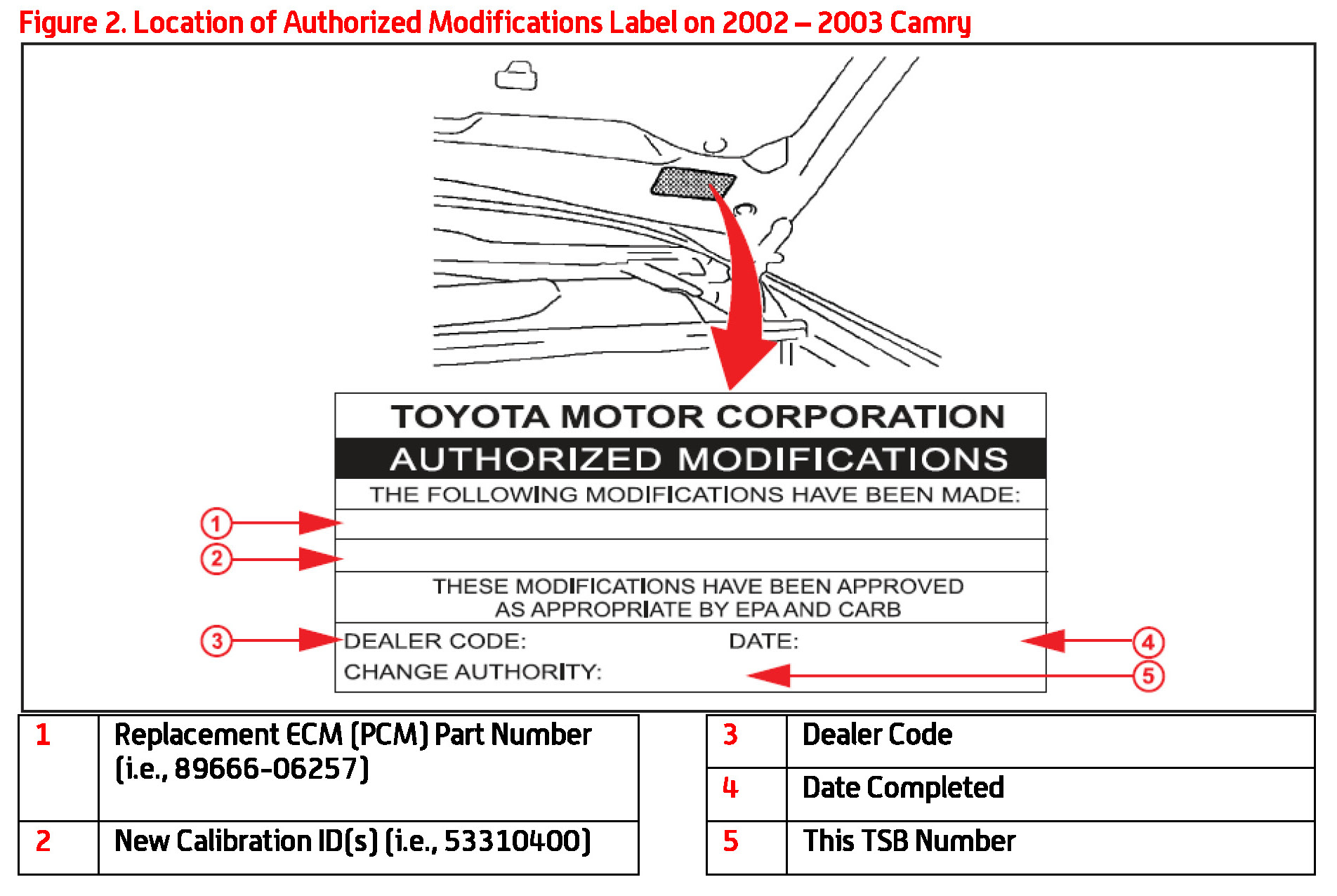 1. Check for the Authorized Modifications Label affixed to the vehicle in the location shown in Figure 2. Confirm if the ECM (PCM) calibration has been updated. If the calibration ID listed is NOT the latest ECM (PCM) calibration - go to step 2.