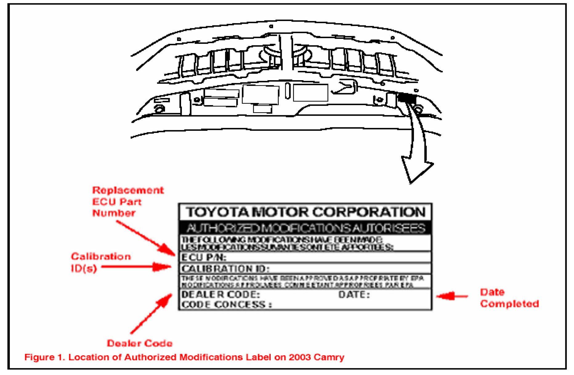 1. Check for the Authorized Modifications Label affixed to the vehicle in the location shown in Figure 1. Confirm if ECM (PCM) calibration has been updated. If not latest ECM (PCM) calibration - go to step 2.