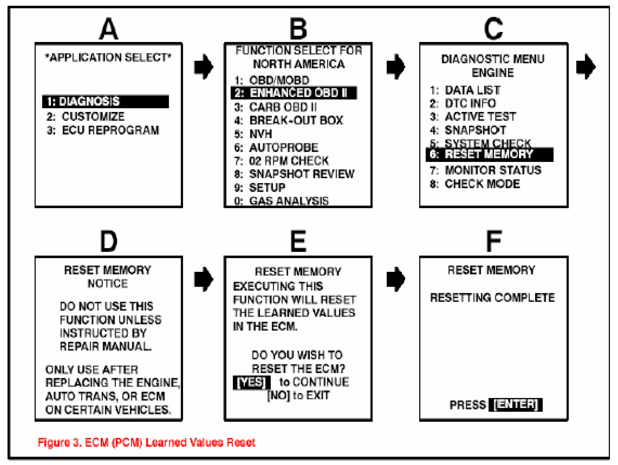 4. Reset the ECM (PCM) learned values using the Diagnostic Tester. Refer to the procedures below.