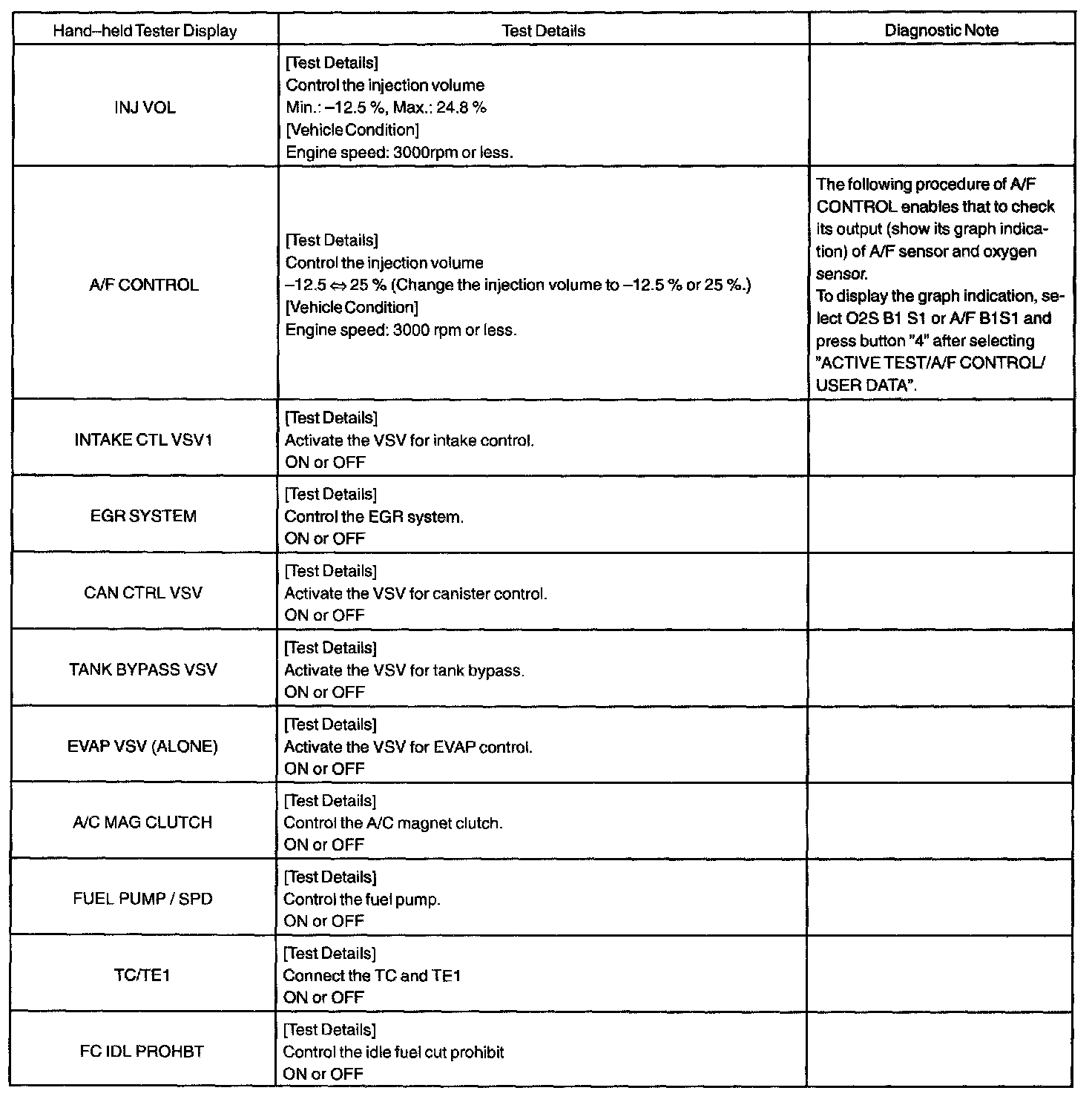 ACTIVE TESTHINT: Performing the ACTIVE TEST using the OBD II scan tool or Hand-held tester allows the relay, VSV, actuator and so on to operate without parts removal. Performing the ACTIVE TEST as a first step of troubleshooting is one of the methods used to shorten the labor time.