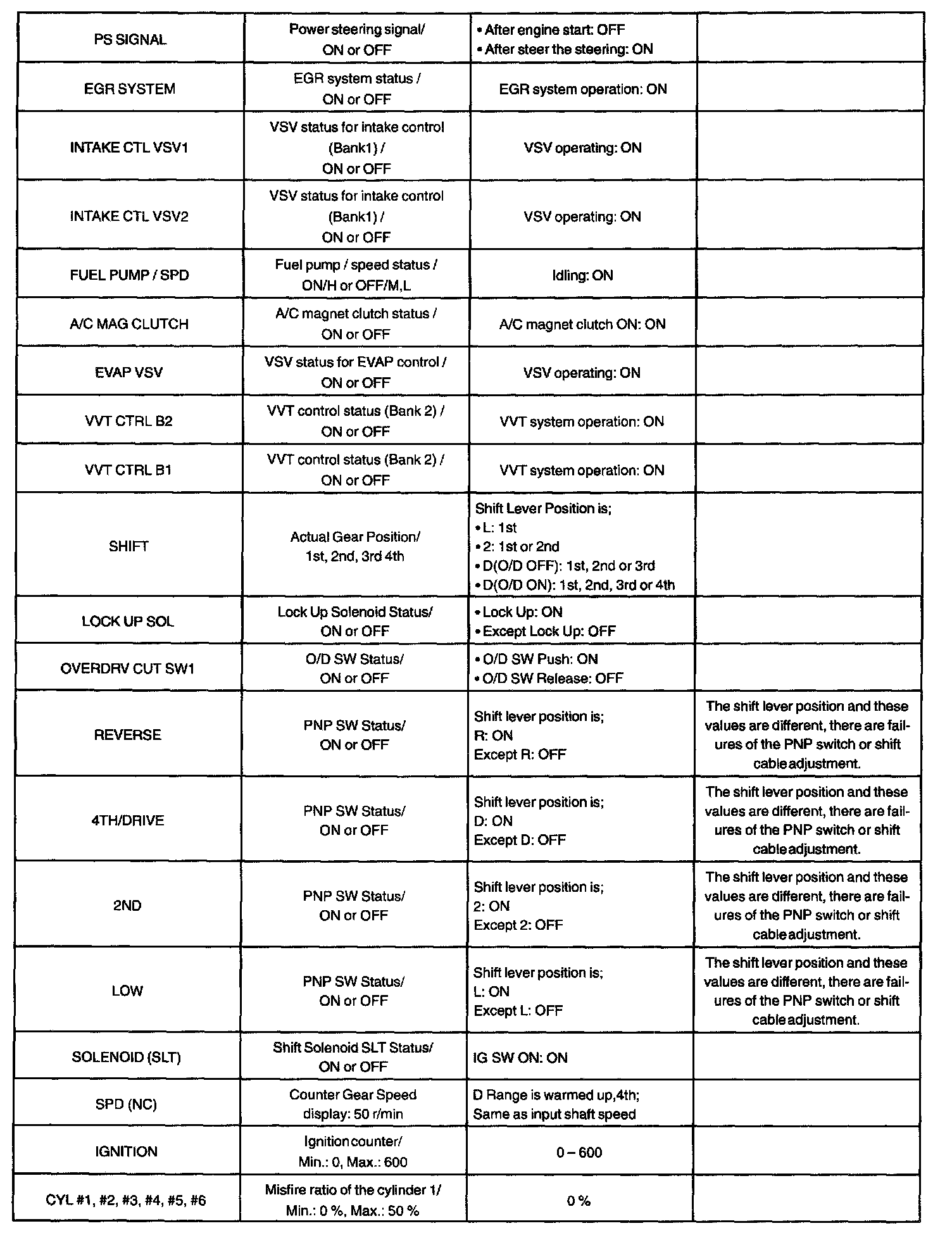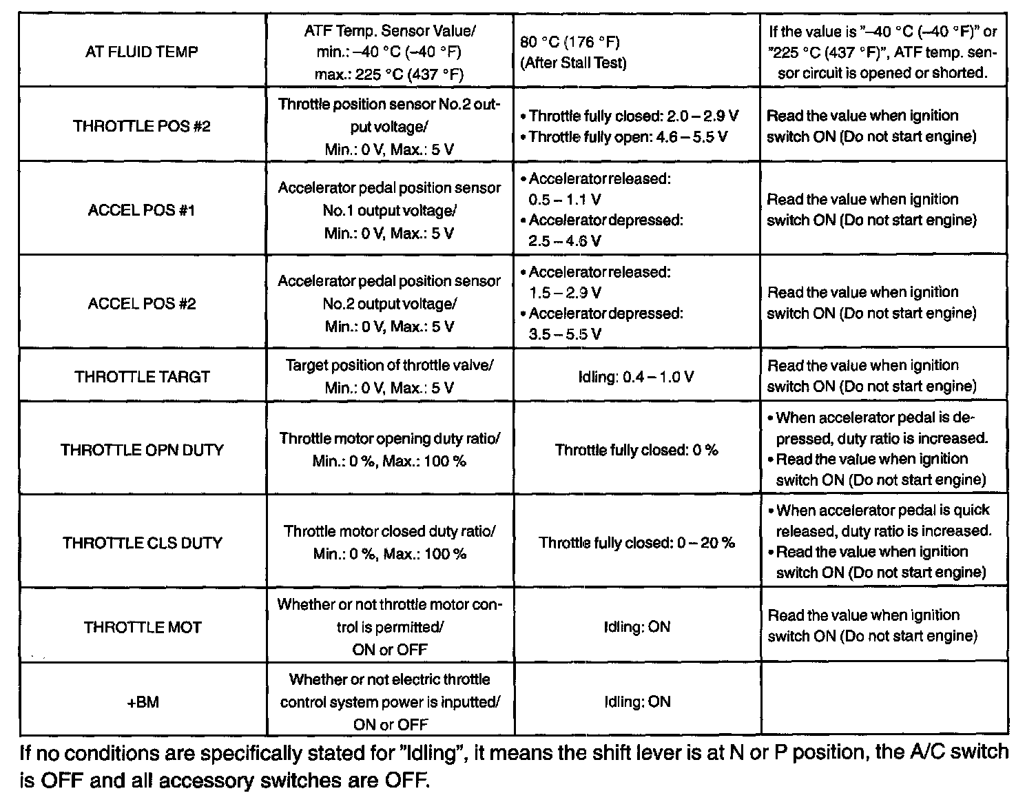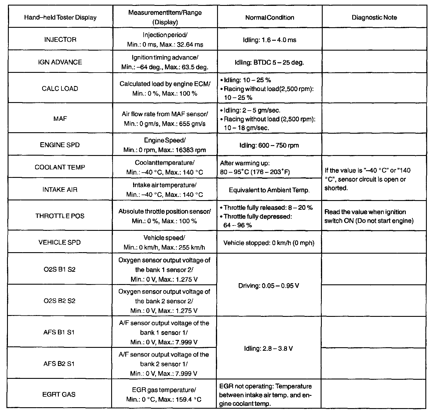 NOTE: The values given for "Normal Condition" are representative values. So, a vehicle may still be normal even if its value differs from those listed here. So, do not solely depend on the "Normal Condition" here when deciding whether a part is faulty or not.