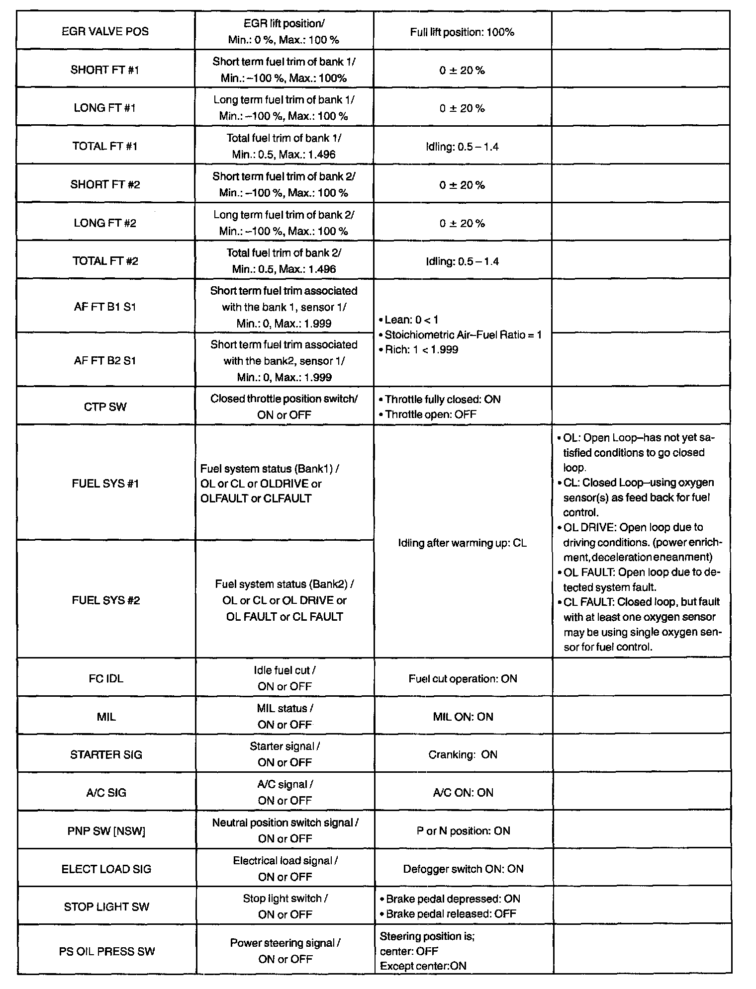 DATA LISTHINT: According to the DATA LIST displayed by the OBD II scan tool or Hand-held tester, you can read the value of the switch, sensor, actuator and so on without parts removal. Reading the DATA LIST as a first step of troubleshooting is one of the method to shorten the labor time.