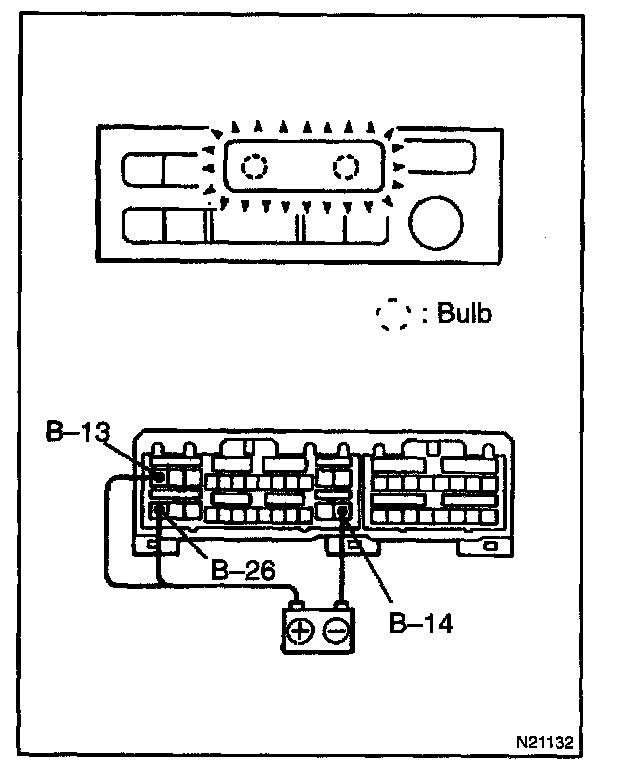 Connect the positive (+) lead from the battery to terminal B-13, B-26 and the negative (-) lead to terminal B-14, then check that the illumination lights up.
