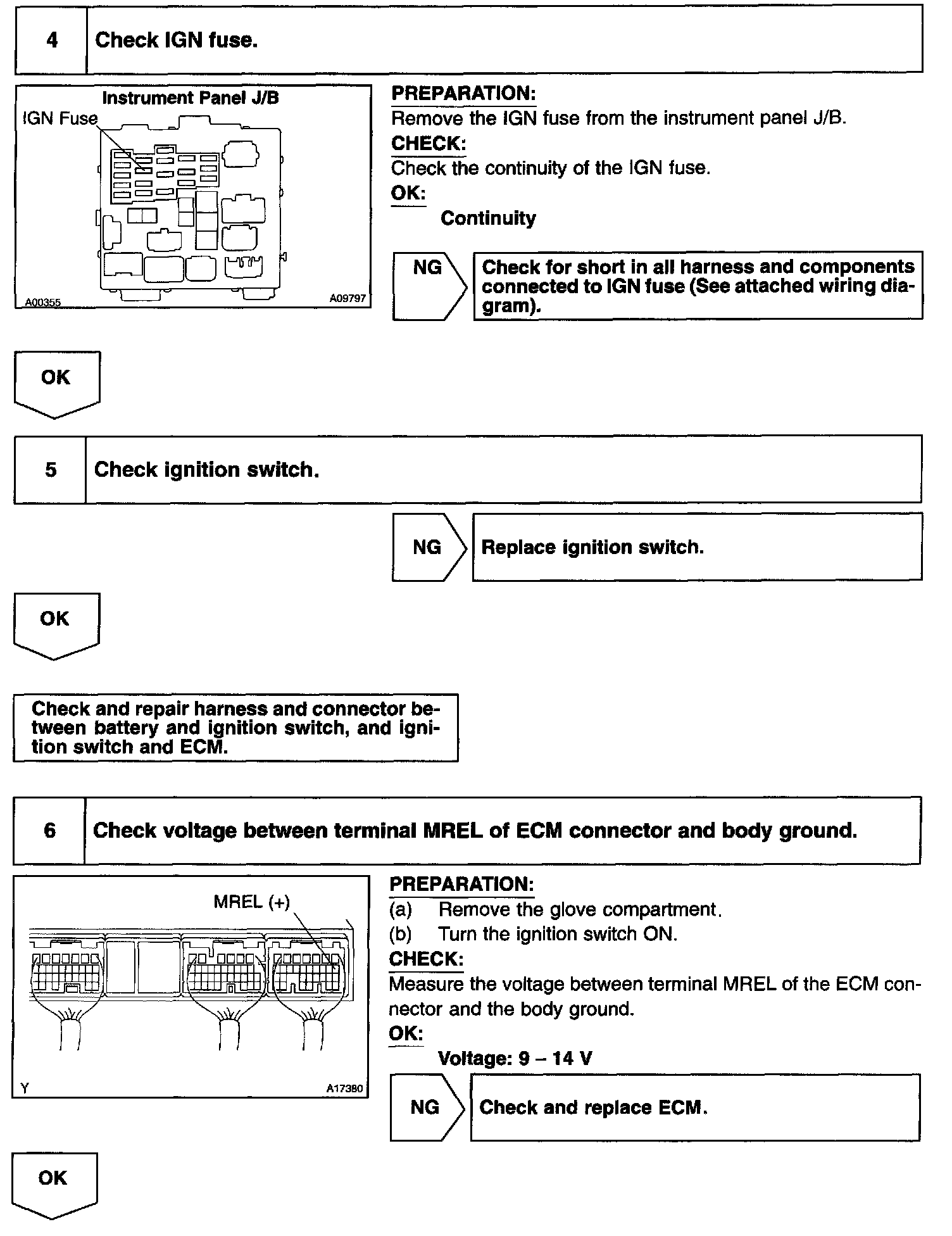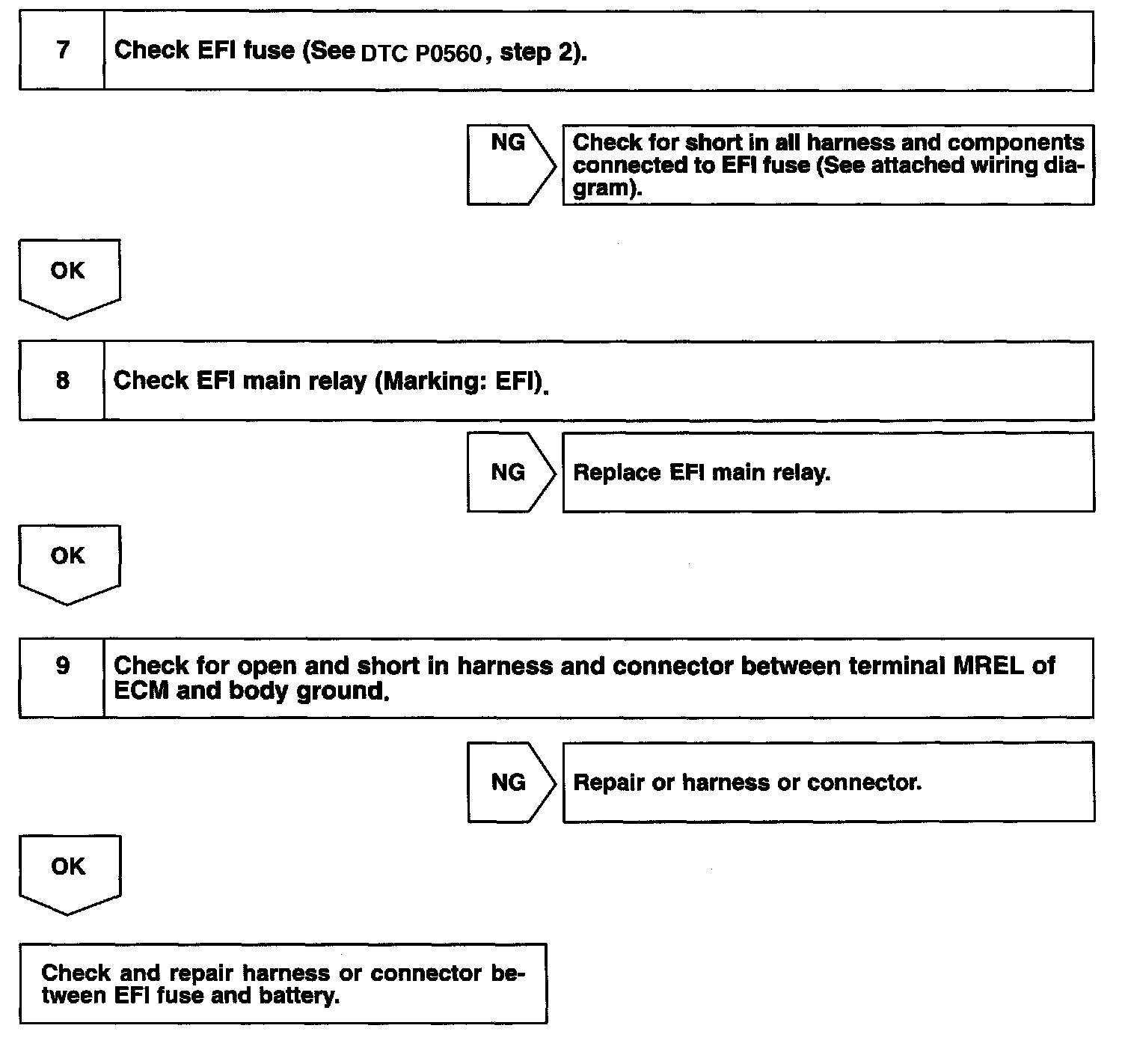 CIRCUIT INSPECTIONWhen the ignition switch is turned ON, battery positive voltage is applied to terminal IGSW of the ECM and the EFI main relay (Marking: EFI) control circuit in the ECM sends a signal to terminal MREL of the ECM switching on the EFI main relay.