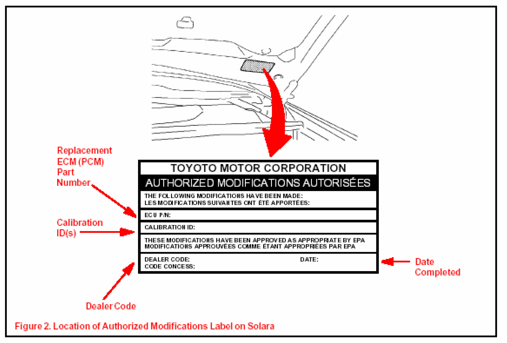 1. Check for the Authorized Modification Label affixed to the vehicle in the location shown in Figure 2. If there is no label present, proceed to step 2.