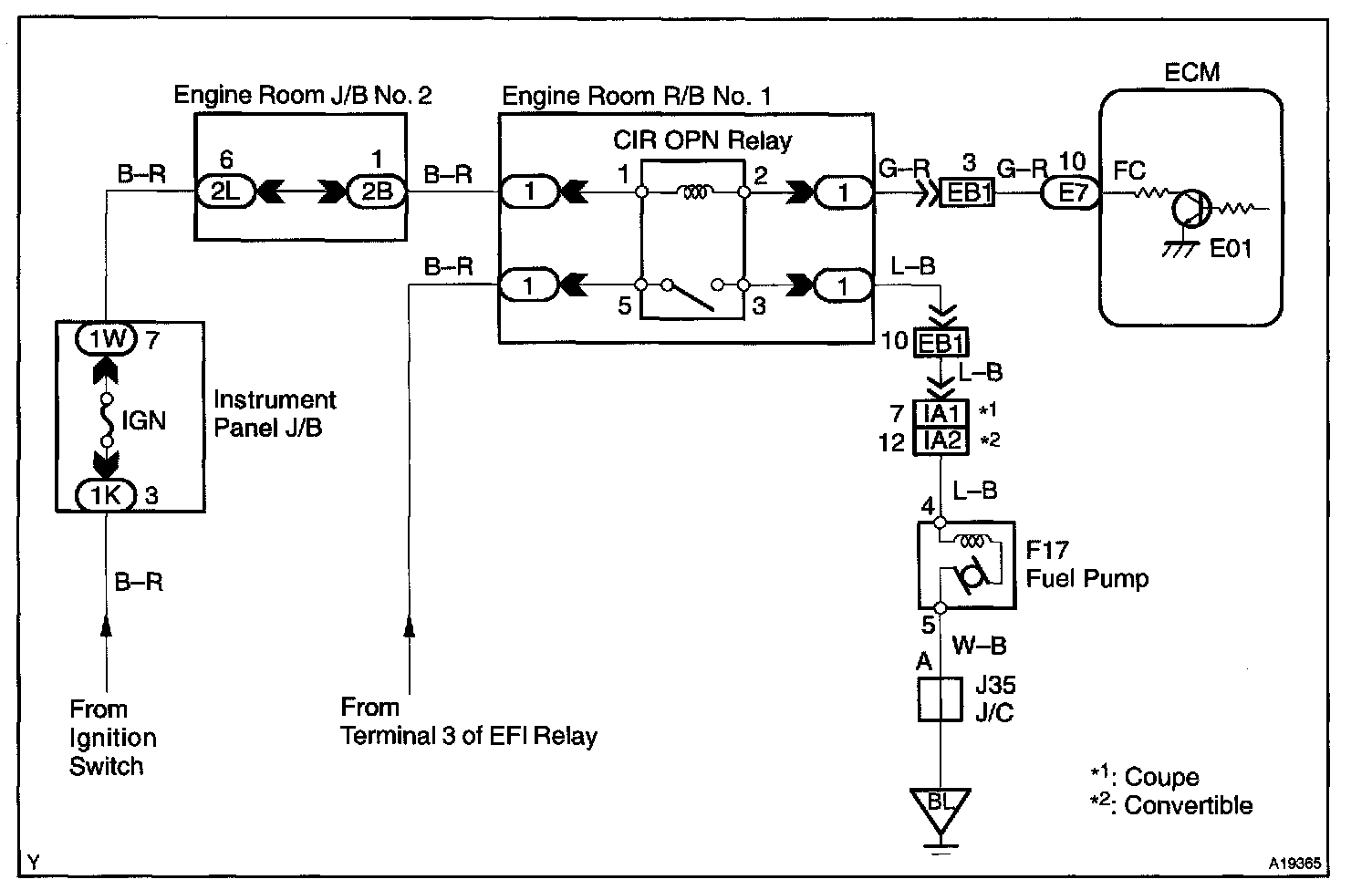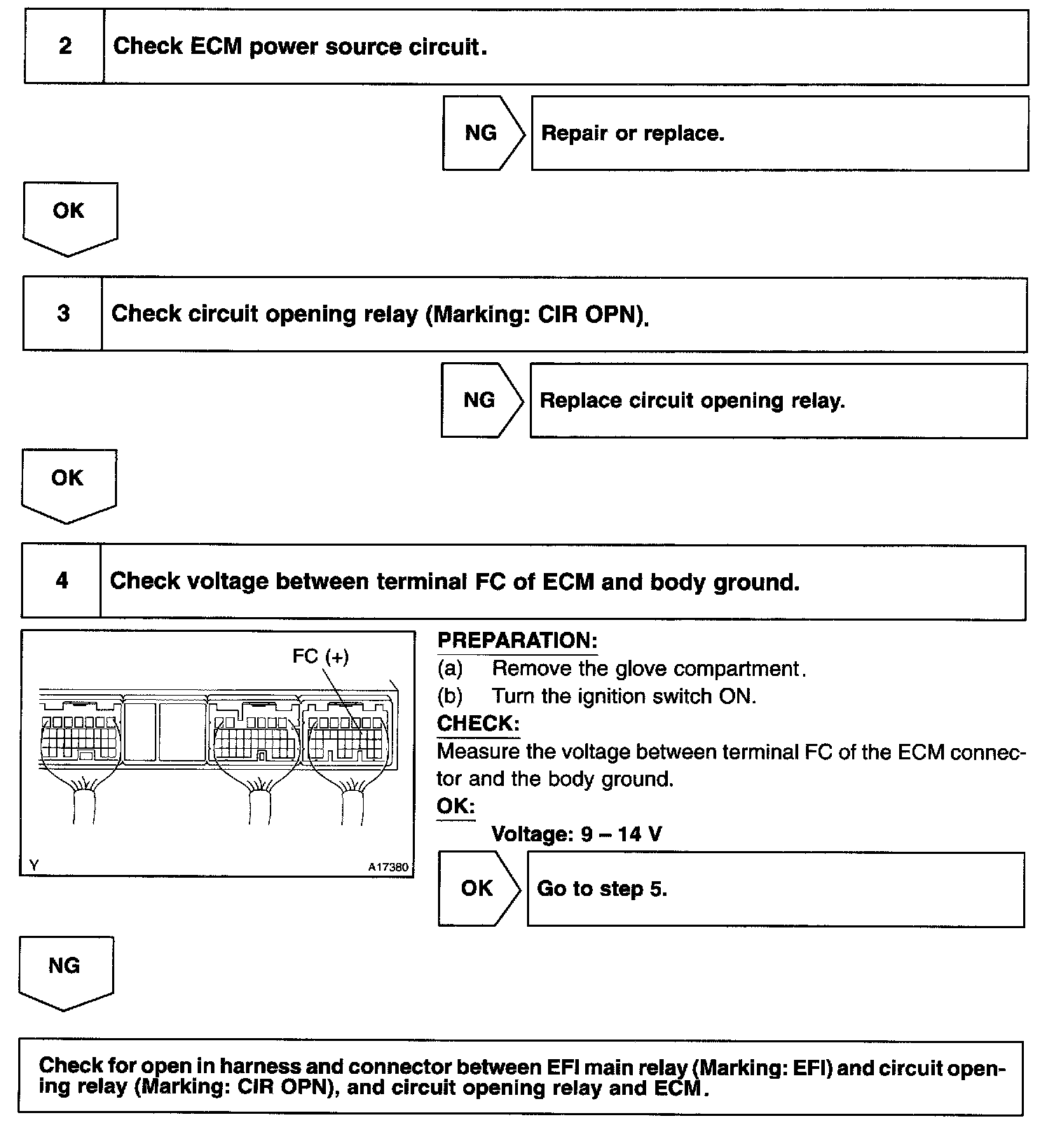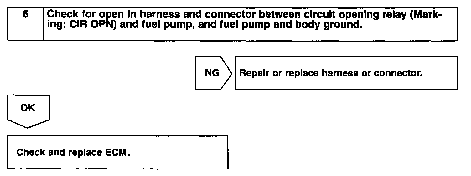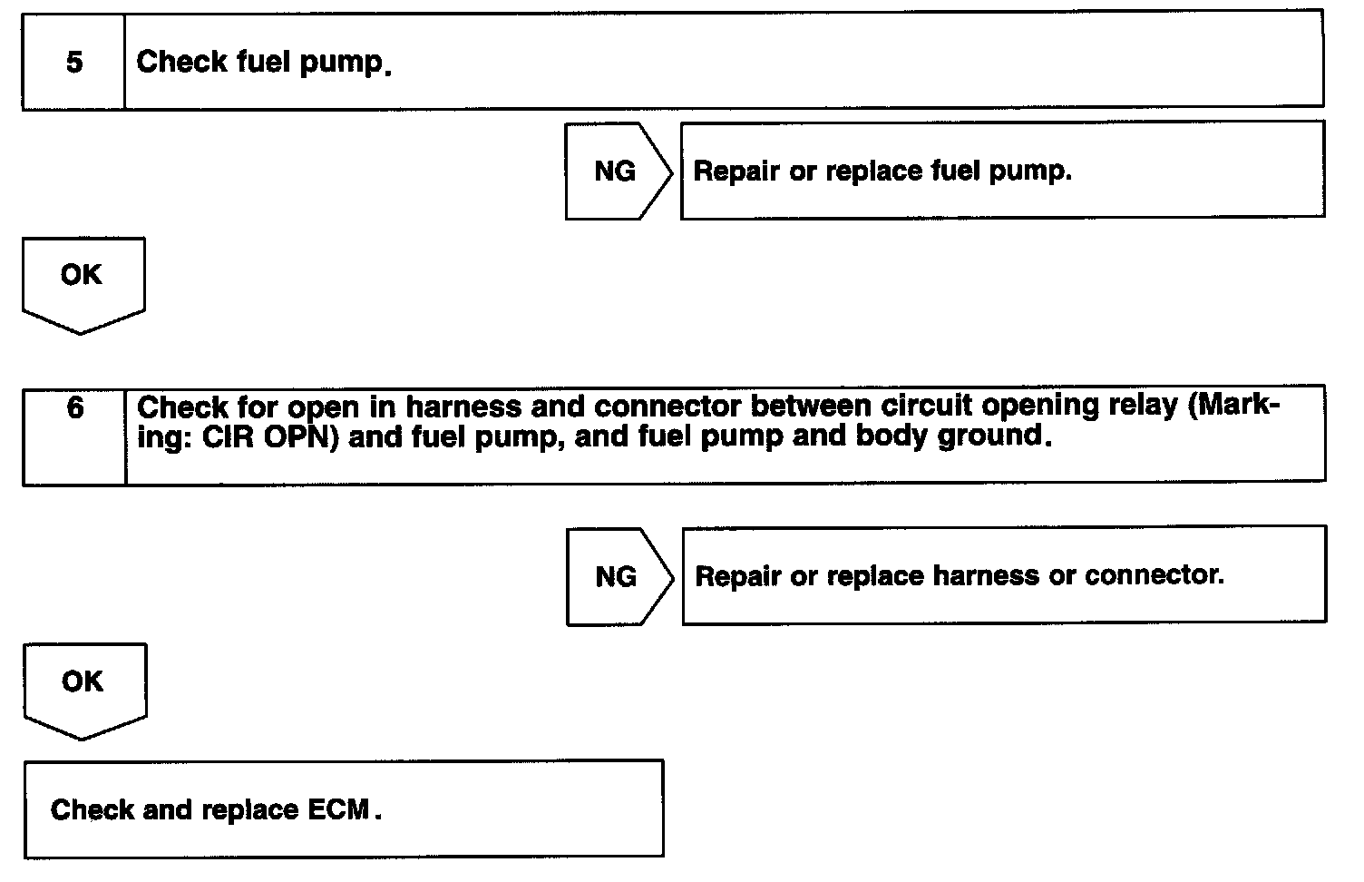 When the STA signal and NE signal are input to the ECM, Tr is turned on, current flows to the coil of the circuit opening relay (Marking: CIR OPN), the relay switches on, power is supplied to the fuel pump and the fuel pump operates.